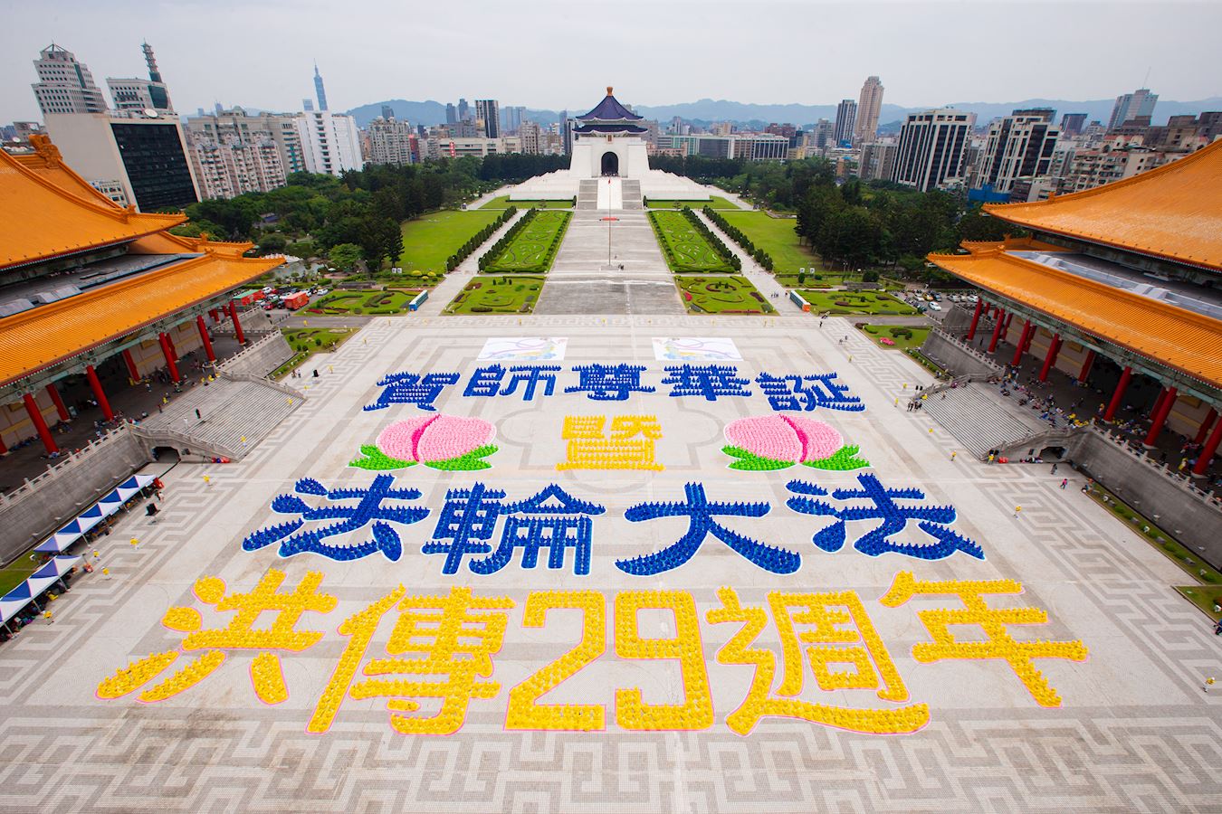 '图1:二零二一年五月一日,五千多位台湾法轮功学员在中正纪念堂的自由广场排出“贺师尊华诞暨法轮大法洪传29周年”巨型图像,庆祝李洪志先生华诞及世界法轮大法日。'