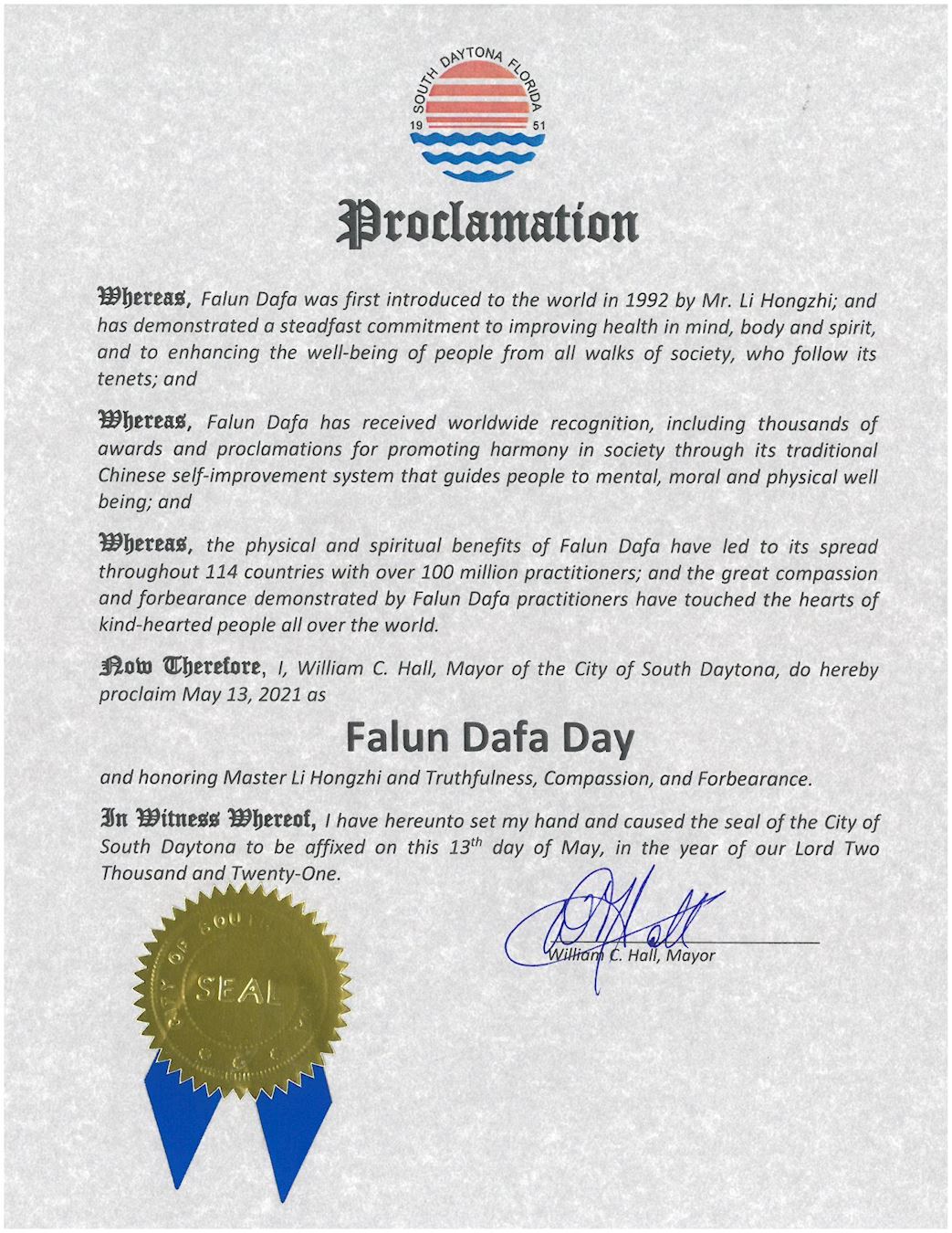 佛罗里达州南代托纳市(South Daytona)市长William C. Hall宣布五月十三日为南代托纳市 “法轮大法日”。赞颂法轮大法修炼者所表现出的大善大忍之心已经感动了世界各地善良人的心,并表彰李洪志大师和真善忍精神。