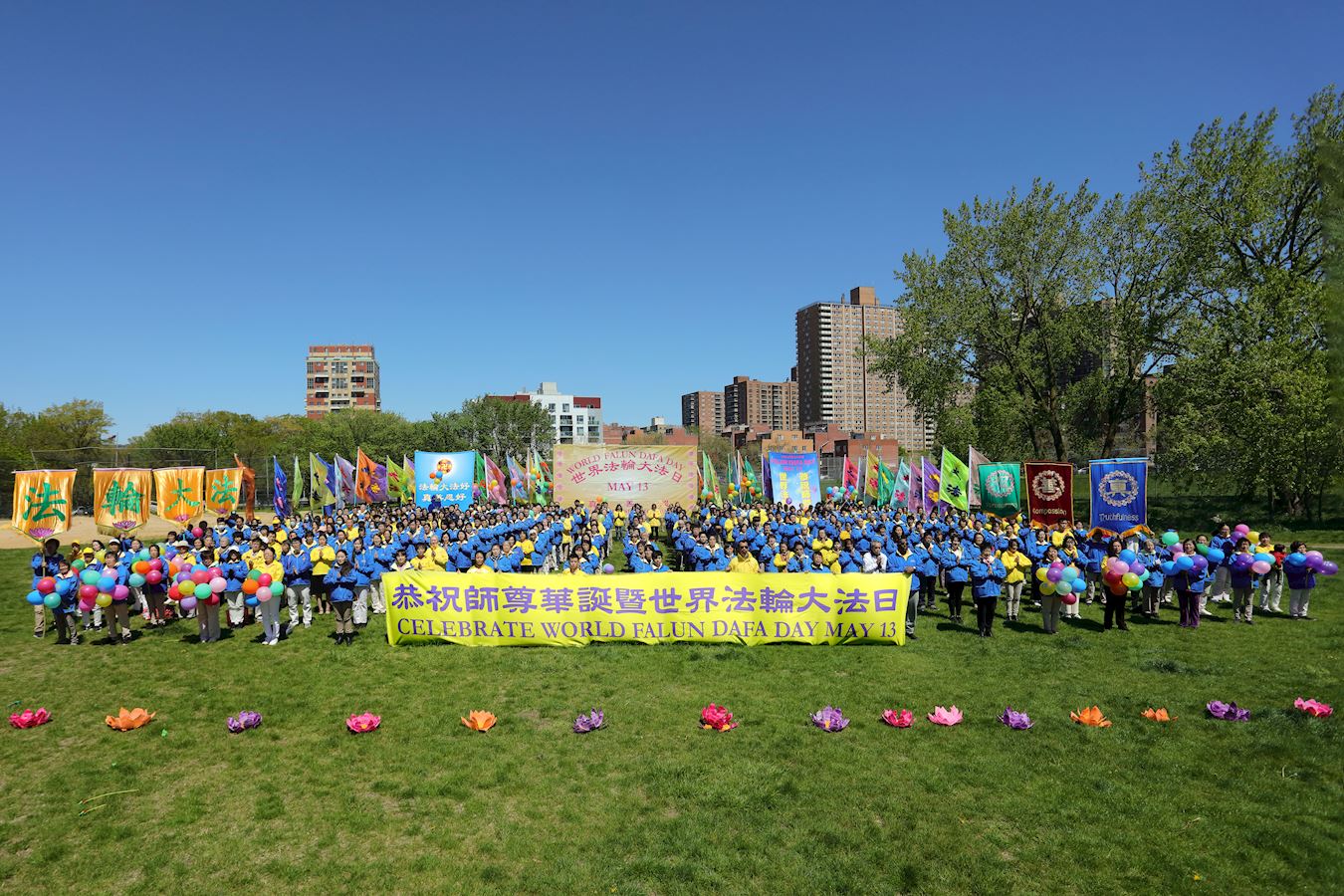 绿色的草坪上旌旗飘扬,大横幅庄重华美,中间是“5月13日世界法轮大法日”、两边是“恭祝师尊华诞暨世界法轮大法日”、“法轮大法好、真善忍好”。不同族裔的法轮功学员,男女老少,穿着整齐的服装双手合十,发自内心的感恩一遍又一遍:“恭祝师父生日快乐!法轮大法好!真善忍好!”