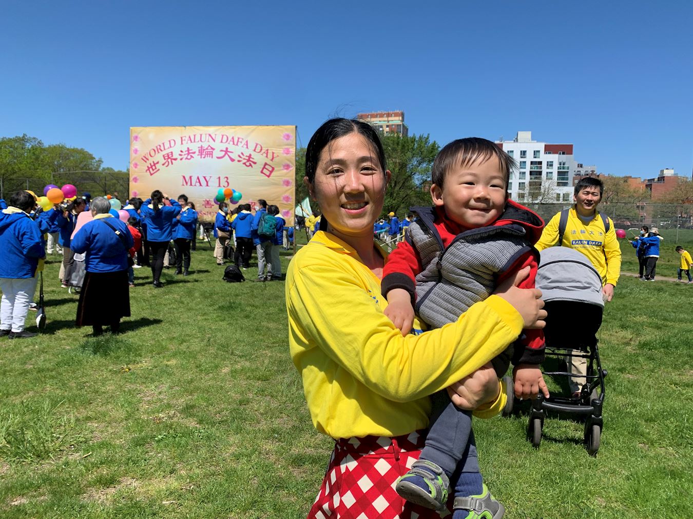 图2:李娟带着孩子一同前来参加当天的活动。她表示,能够修炼大法,感到无比幸运、幸福。
