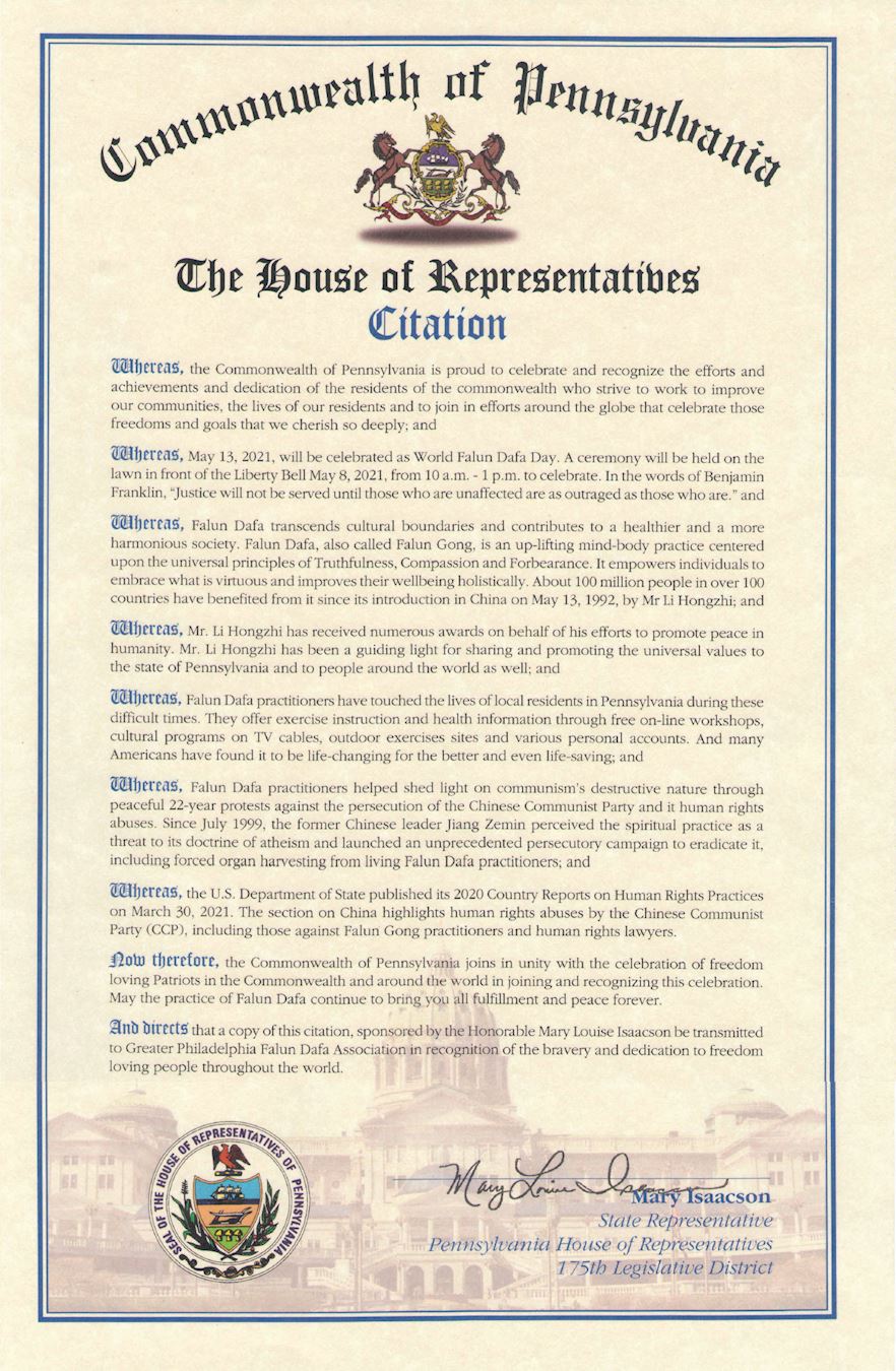 并指示,将这份由玛丽·路易斯·艾萨克森(Mary Louise Isaacson)议员发起的褒奖副本转交给大费城法轮大法学会,以表彰其勇气及对全世界人民热爱自由的奉献。