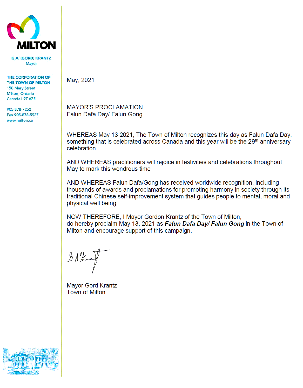 我,密尔顿市长戈登·克兰茨在此宣布2021年5月13日为“米尔顿市法轮大法日”,并鼓励大家支持这一活动。