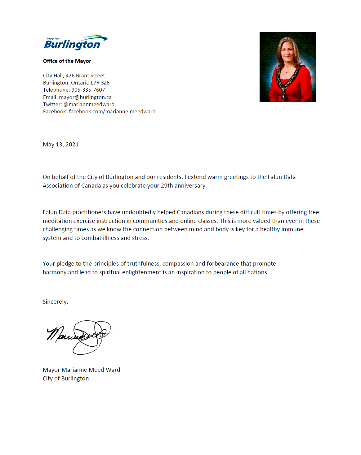 '图4:安省伯灵顿市(Burlington)市长贺信。'
