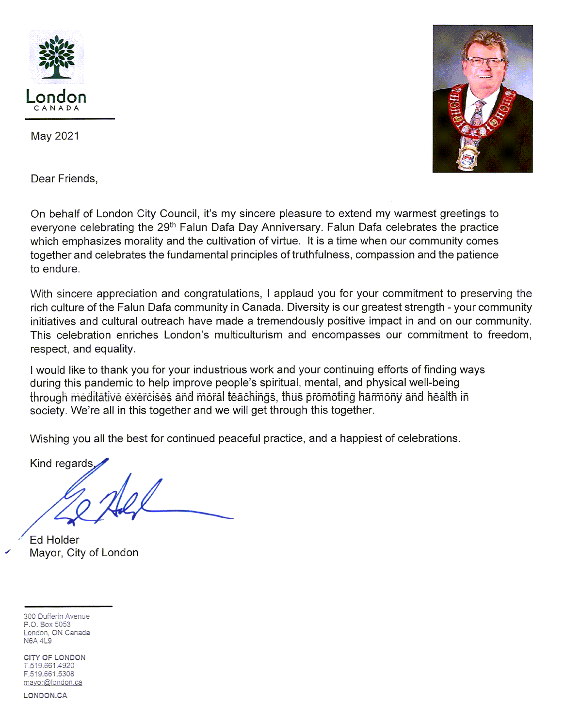 安省伦敦(London)市长埃德·霍尔德(Ed Holder)在贺信中向庆祝“法轮大法月”的所有人致以最热忱的问候。法轮大法强调道德修为。现在,正是让我们的社区走到一起,共同庆祝‘真、善、忍’基本准则的时刻。