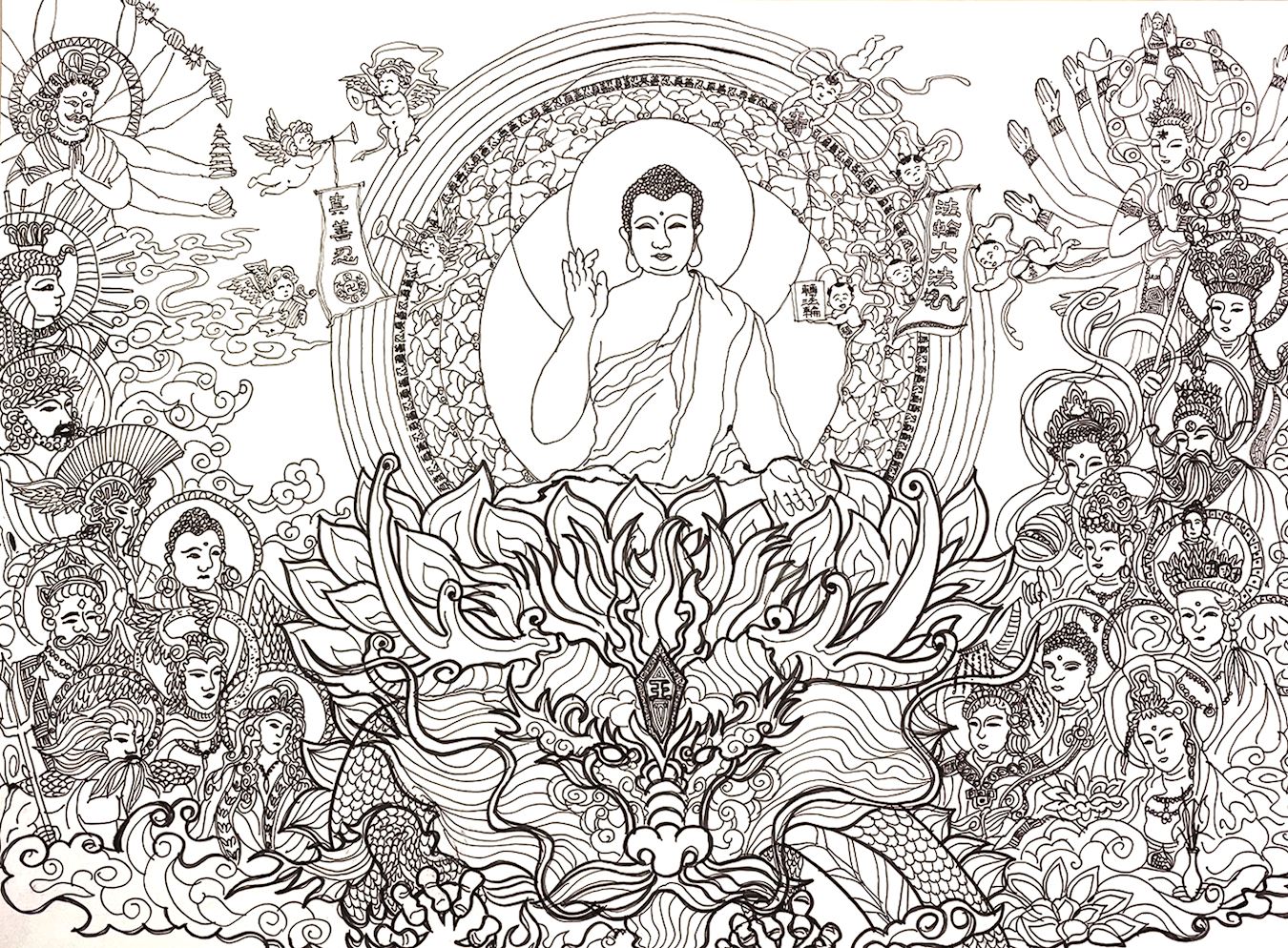 另外,师尊旁边护法的佛道神,还有好几尊我没画進去,因为画不進去,他们自己选出要出现在画面中的代表,留在我的出定后的头脑中。