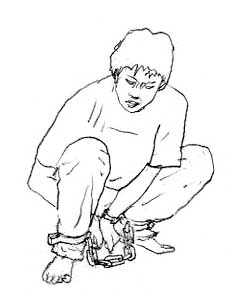 中共酷刑示意图:吊铐、固定铐、反铐在大树上