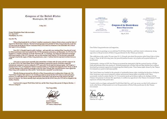 宾州联邦众议员佩里和道尔先后给费城法轮大法学会发出贺信,称赞法轮大法,表达对法轮功学员的敬意。