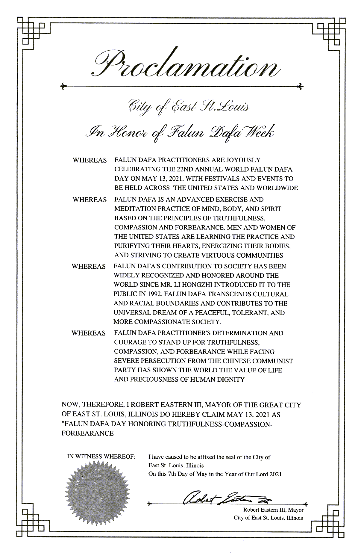 因此,我罗伯特-埃斯特尔三世,伊利诺伊州东圣路易斯市市长,特此宣布,二零二一年五月十三日为“法轮大法日,表彰真善忍”。