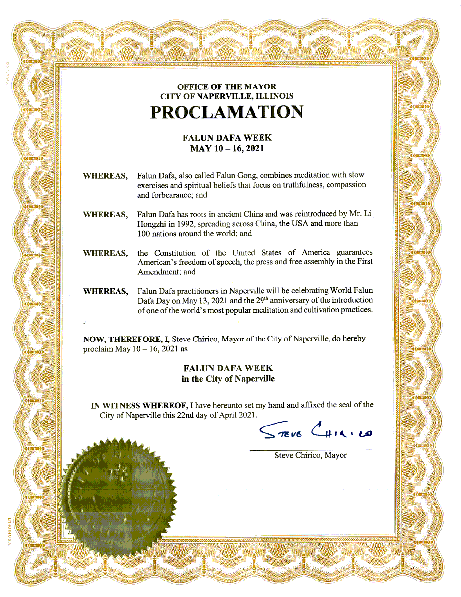 伊利诺伊市瑞柏市(Naperville)市长也颁发褒奖,宣布五月十日至五月十六日为瑞柏市的“法轮大法周”。芝加哥西郊的瑞柏市(Naperville) 被niche网评选为2021年“美国最适合建立家庭的城市”的第一名,拥有“美国最好公立学校的城市”的第一名,以及“美国最适合居住城市”的第三名。也因此吸引了大批的华人定居在此。
