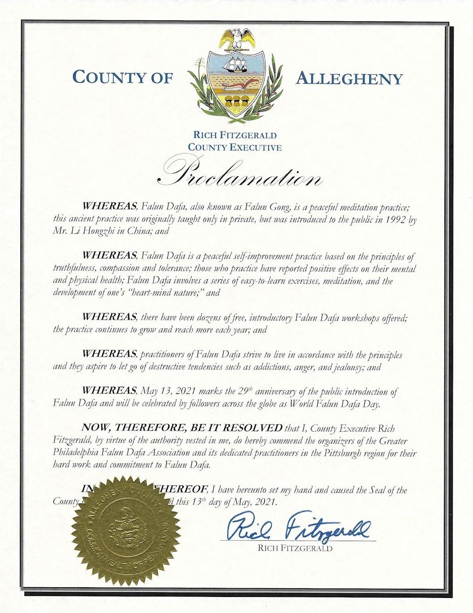 【明慧网二零二一年五月八日】2021年5月13日世界法轮大法日到来之际,美国宾州阿勒格尼郡郡长菲茨杰拉德(Rich Fitzgerald)颁发褒奖,赞扬法轮大法修炼者严格要求自己做好人,并在这过程中不断地去除贪婪、暴躁和妒嫉等缺点。