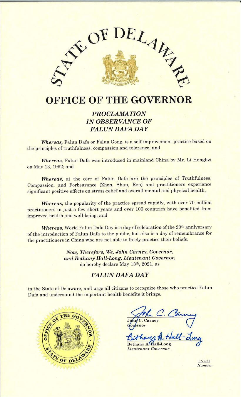 因此,我们,德位华州长约翰·卡尼(John Carney)和副州长伯大尼·赫隆(Bethany Hall-Long),在此宣布2021年5月13日为特拉华州法轮大法日。我们也希望大家一起来支持法轮大法修炼者并了解这项功法在增进健康上的益处。