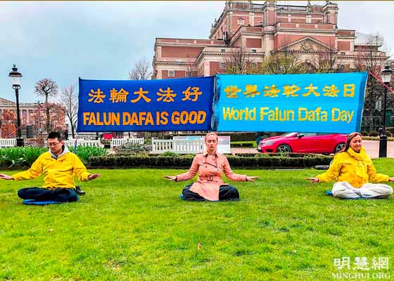 五月八日,瑞典部份法轮功学员在首都斯德哥尔摩皇家花园以展示功法、真相展板,分享修炼体会的形式庆祝世界法轮大法日。