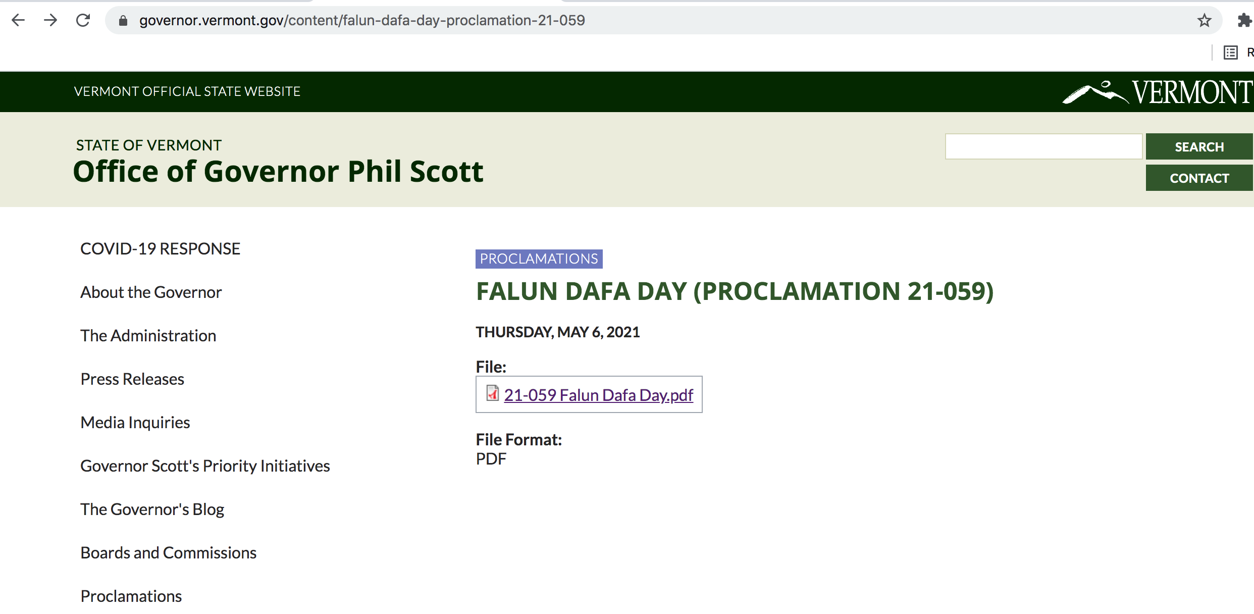 ![]() 佛蒙特州州政府的官方网站上刊登褒奖令(州政府网站截图) |