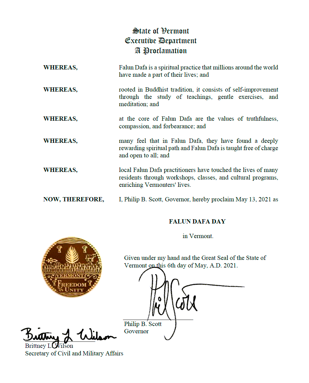 因此,我,菲利浦·斯科特,州长,在此宣布2021年5月13日是佛蒙特州的法轮大法日。
