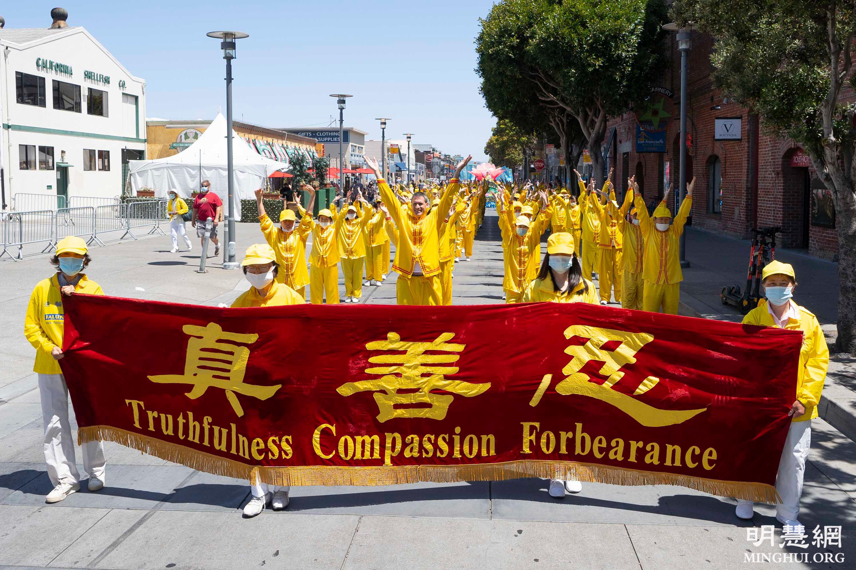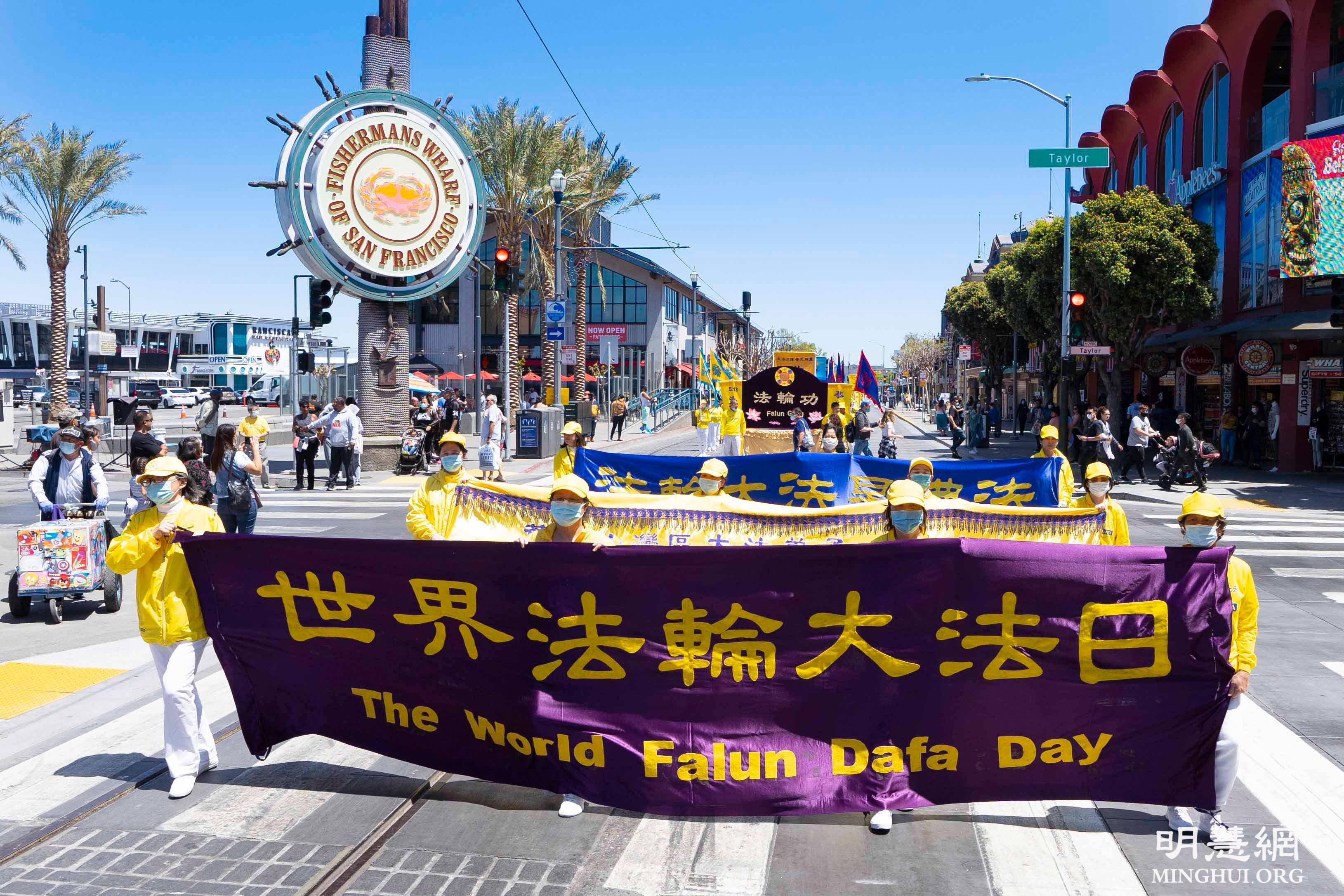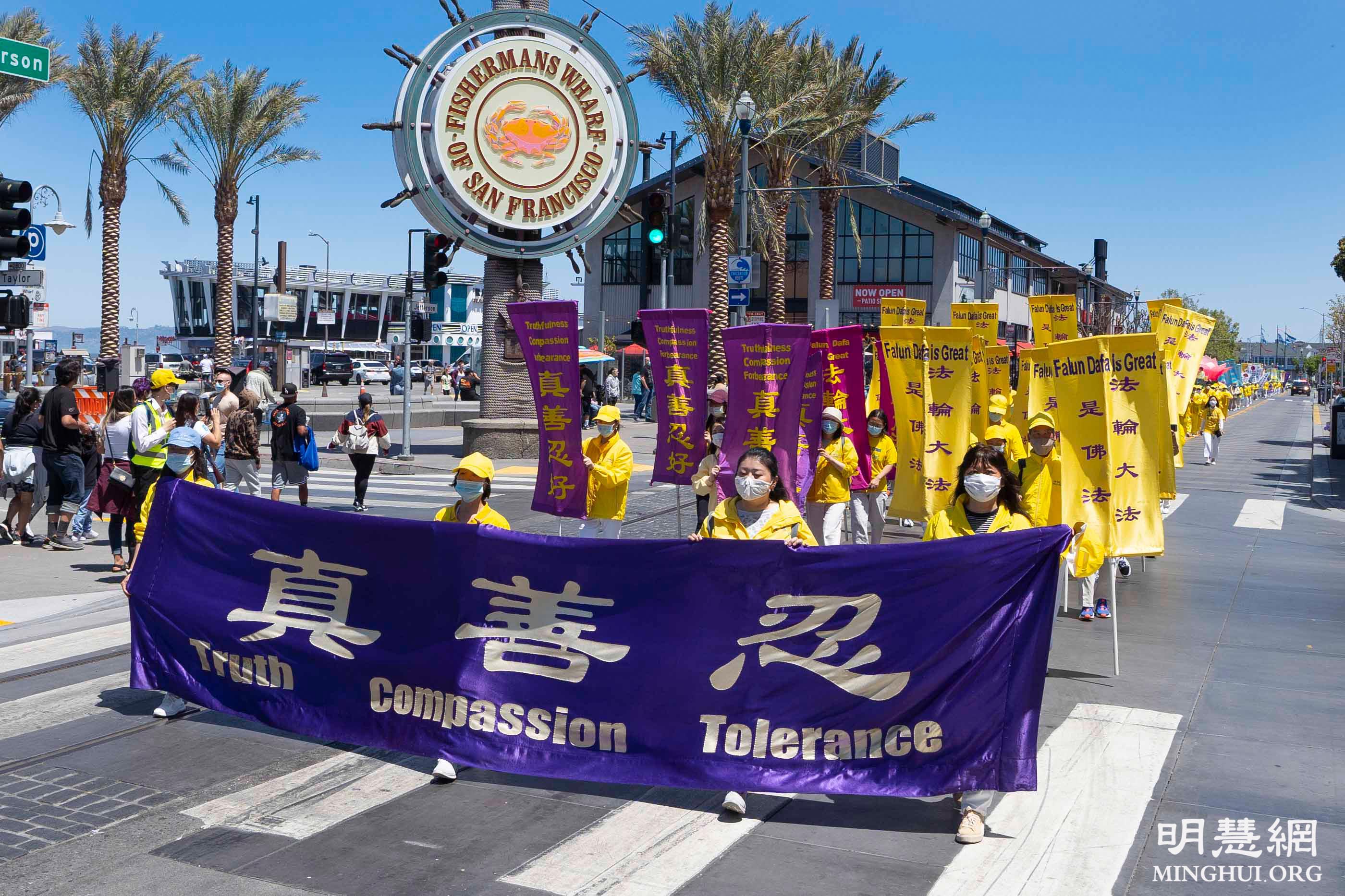 【明慧网二零二一年五月九日】(明慧记者贾维、王英旧金山报道)二零二一年五月十三日,是法轮大法弘传世界二十九周年纪念日,也是法轮功创始人李洪志大师的七十华诞,普天同庆。五月八日星期六,美国旧金山法轮功学员在渔人码头旅游景点游行,恭祝师父华诞,庆祝“世界法轮大法日”。