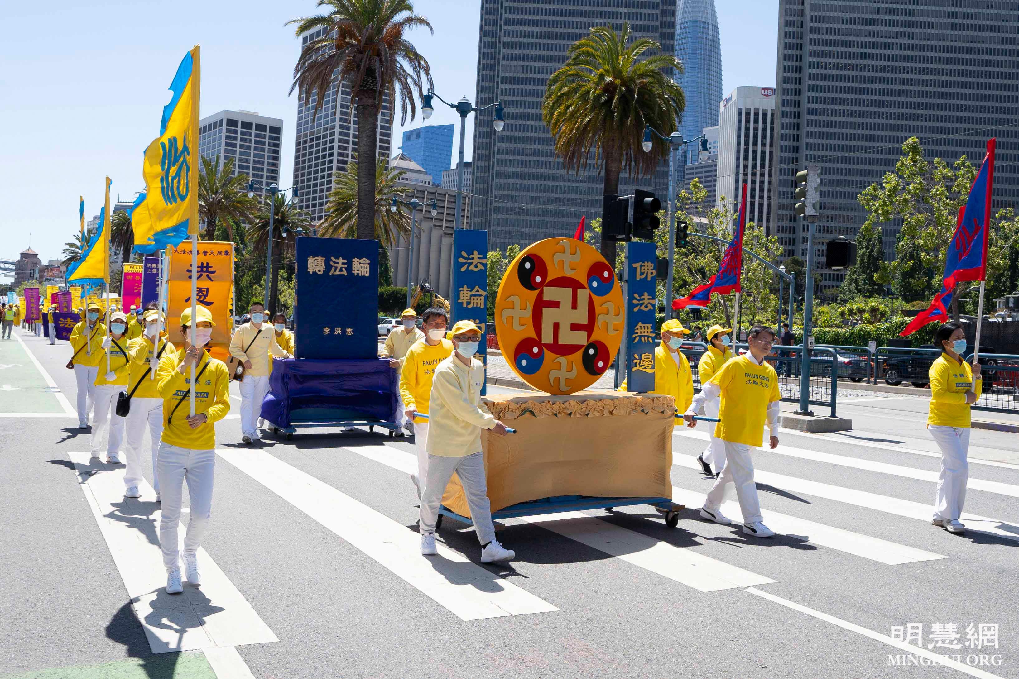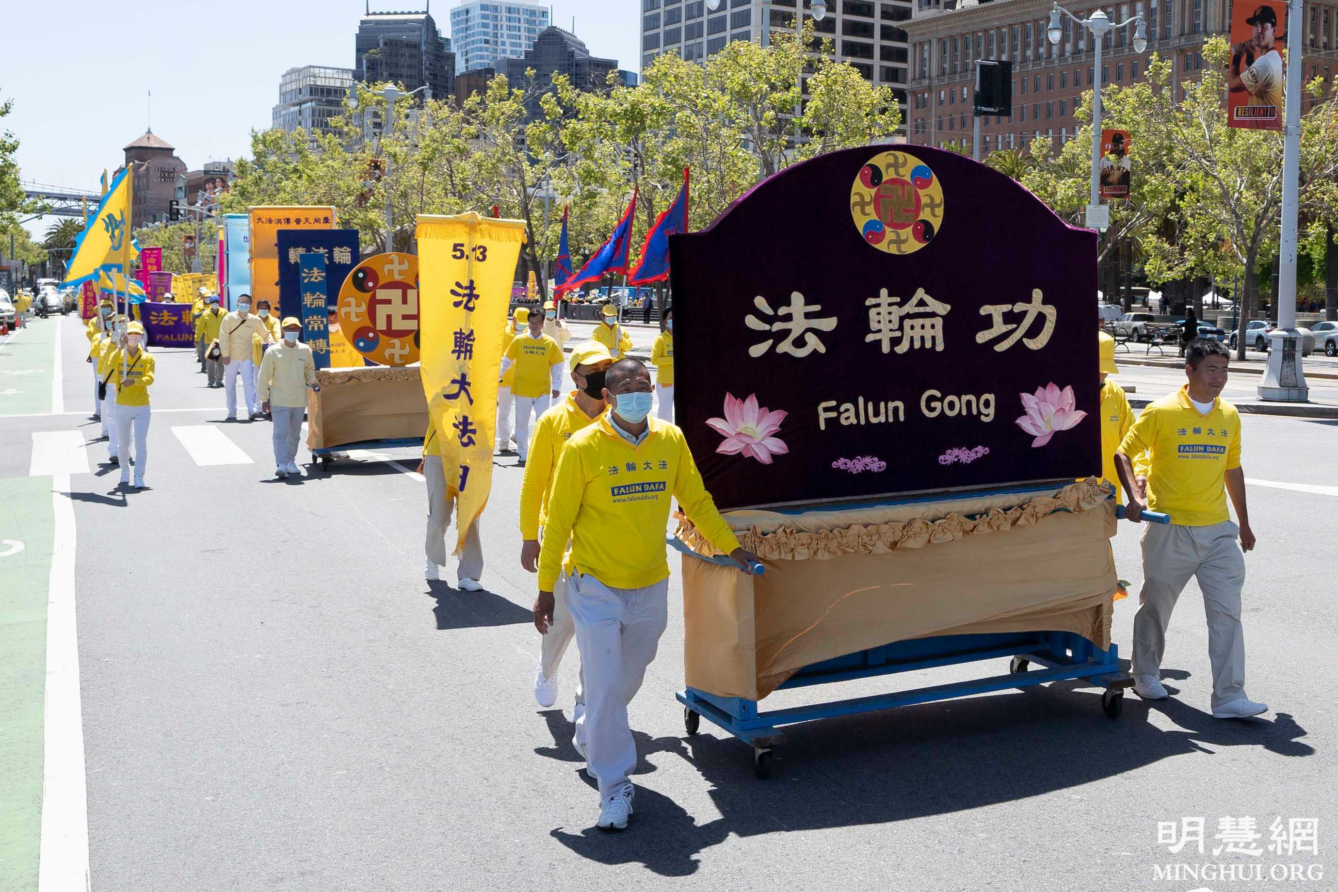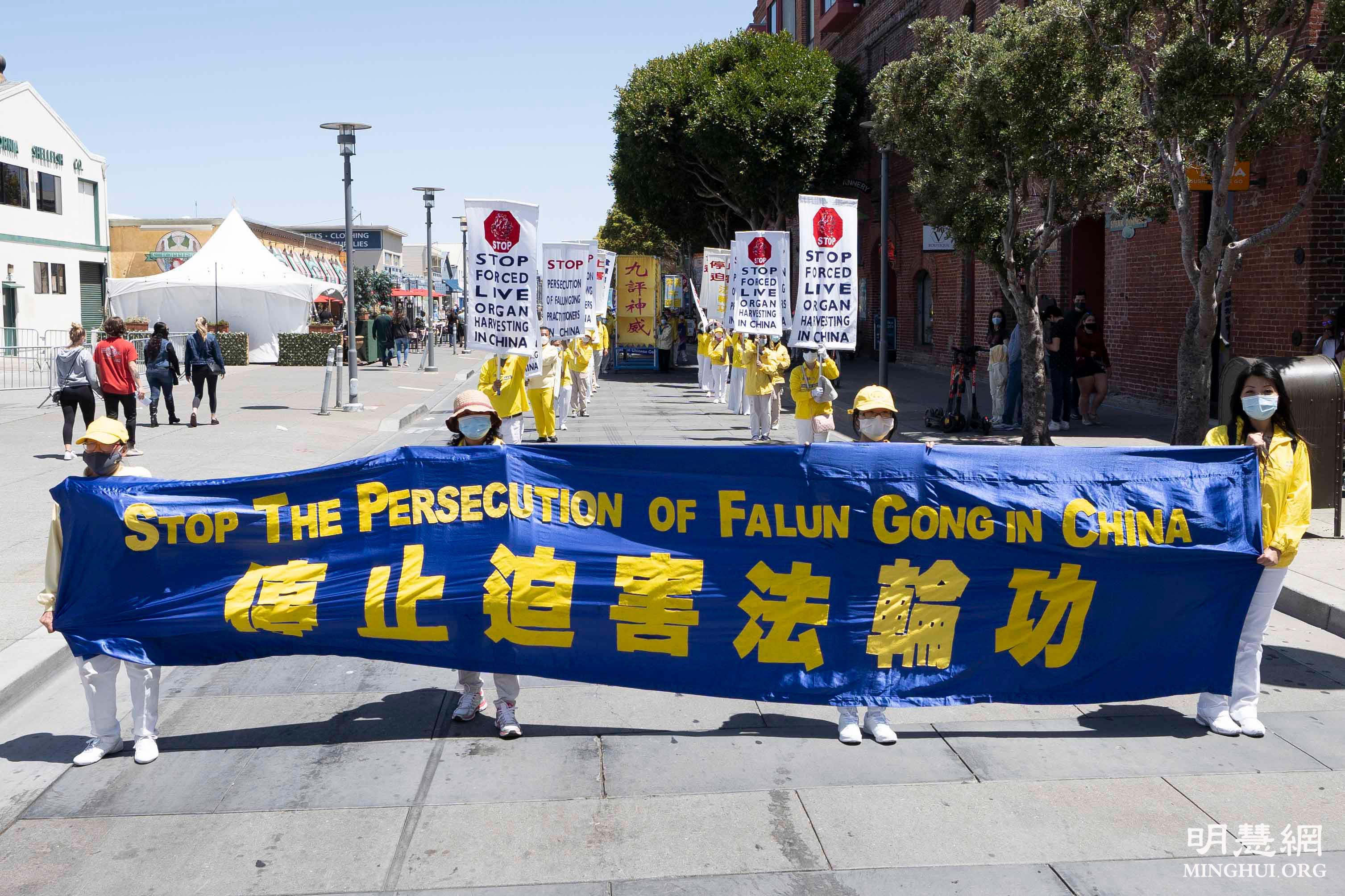 【明慧网二零二一年五月九日】(明慧记者贾维、王英旧金山报道)二零二一年五月十三日,是法轮大法弘传世界二十九周年纪念日,也是法轮功创始人李洪志大师的七十华诞,普天同庆。五月八日星期六,美国旧金山法轮功学员在渔人码头旅游景点游行,恭祝师父华诞,庆祝“世界法轮大法日”。