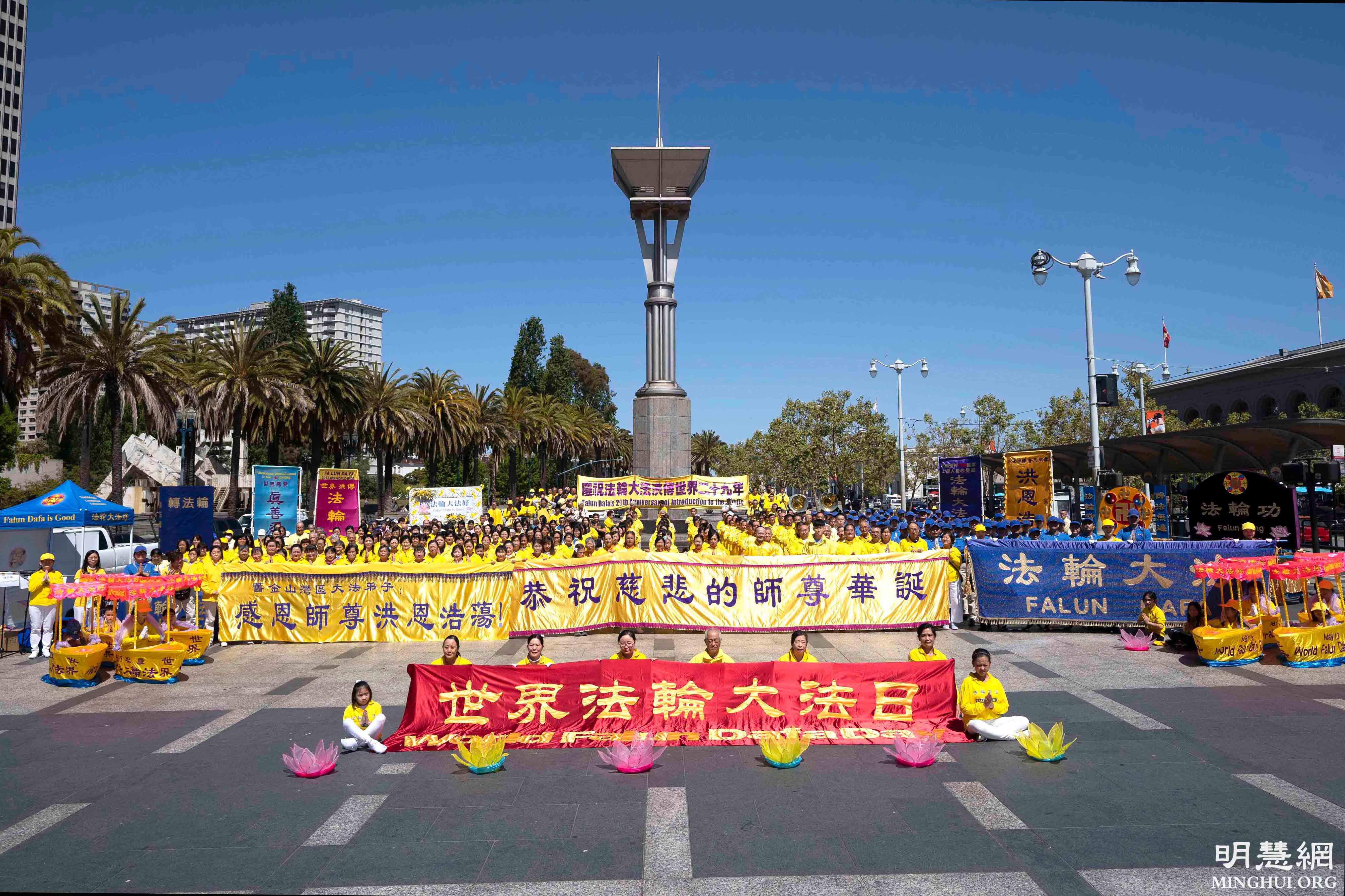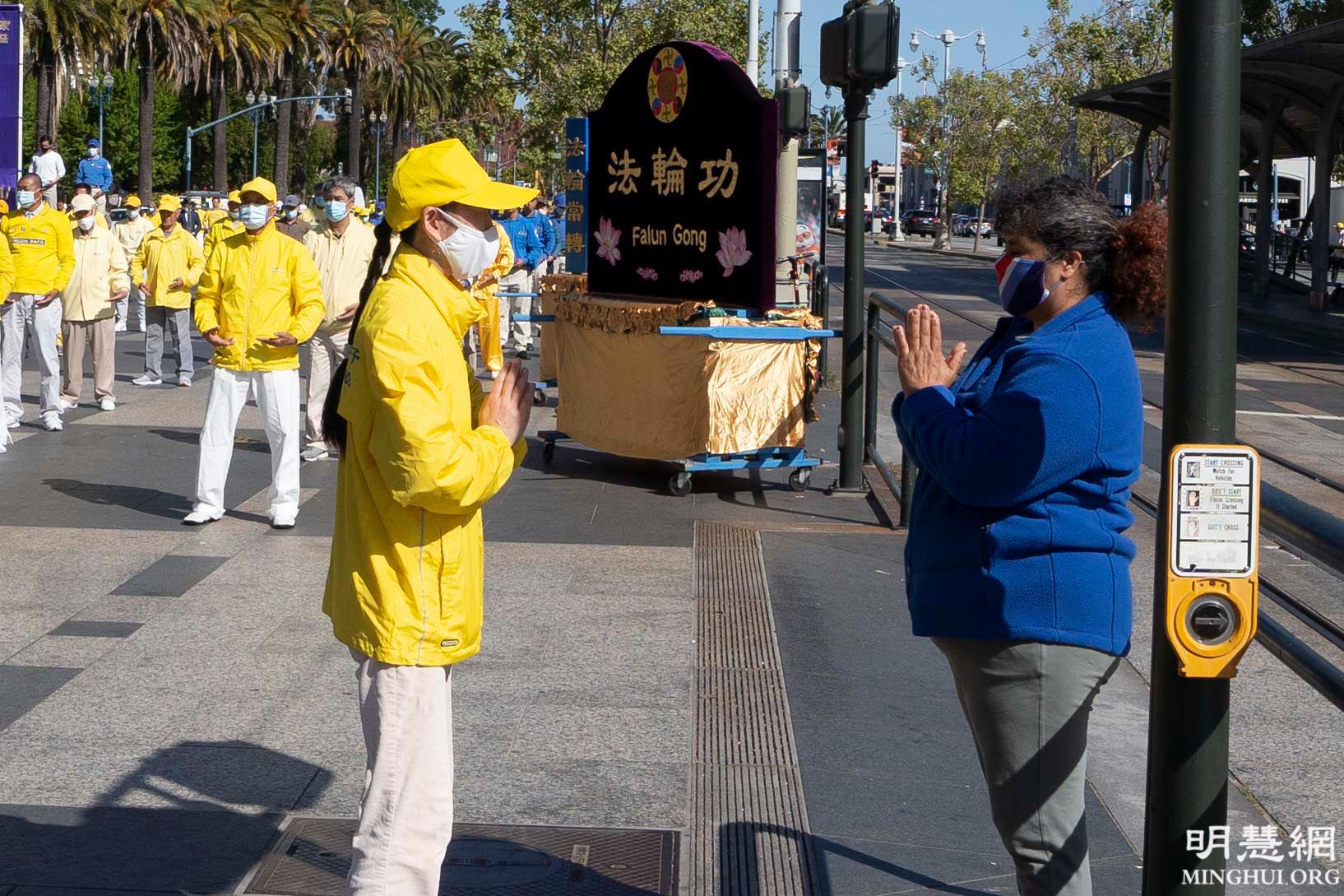 星期六,阳光明媚,法轮功学员首先在旧金山渡轮大厦(Ferry Building)集体炼功,展示祥和优美的功法,庆祝法轮大法日。许多游客被祥和的场面吸引,随着法轮功学员的炼功姿势在比划着学。现场还有民众主动要求学炼法轮功。