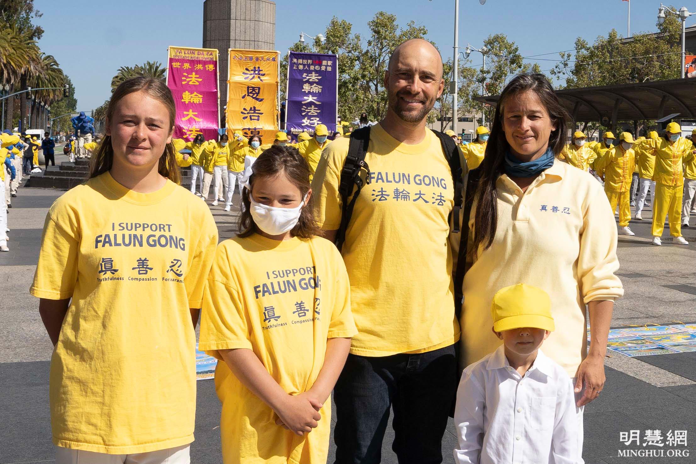 西人学员安迪·埃尔斯莫尔(Andy Ellsmore)一家五口都修炼法轮功。他们从加州东北部城市特拉基(Truckee)来参加活动。安迪说,他非常高兴能参加今天的活动,庆祝师尊华诞。“今天是个美好的日子,我希望人们能了解法轮大法的美好。我和太太都从修炼法轮功中受益,我们的孩子也修炼法轮功。修炼法轮功,让我们的家庭变得更加和睦。我们感谢师父的慈悲救度。”