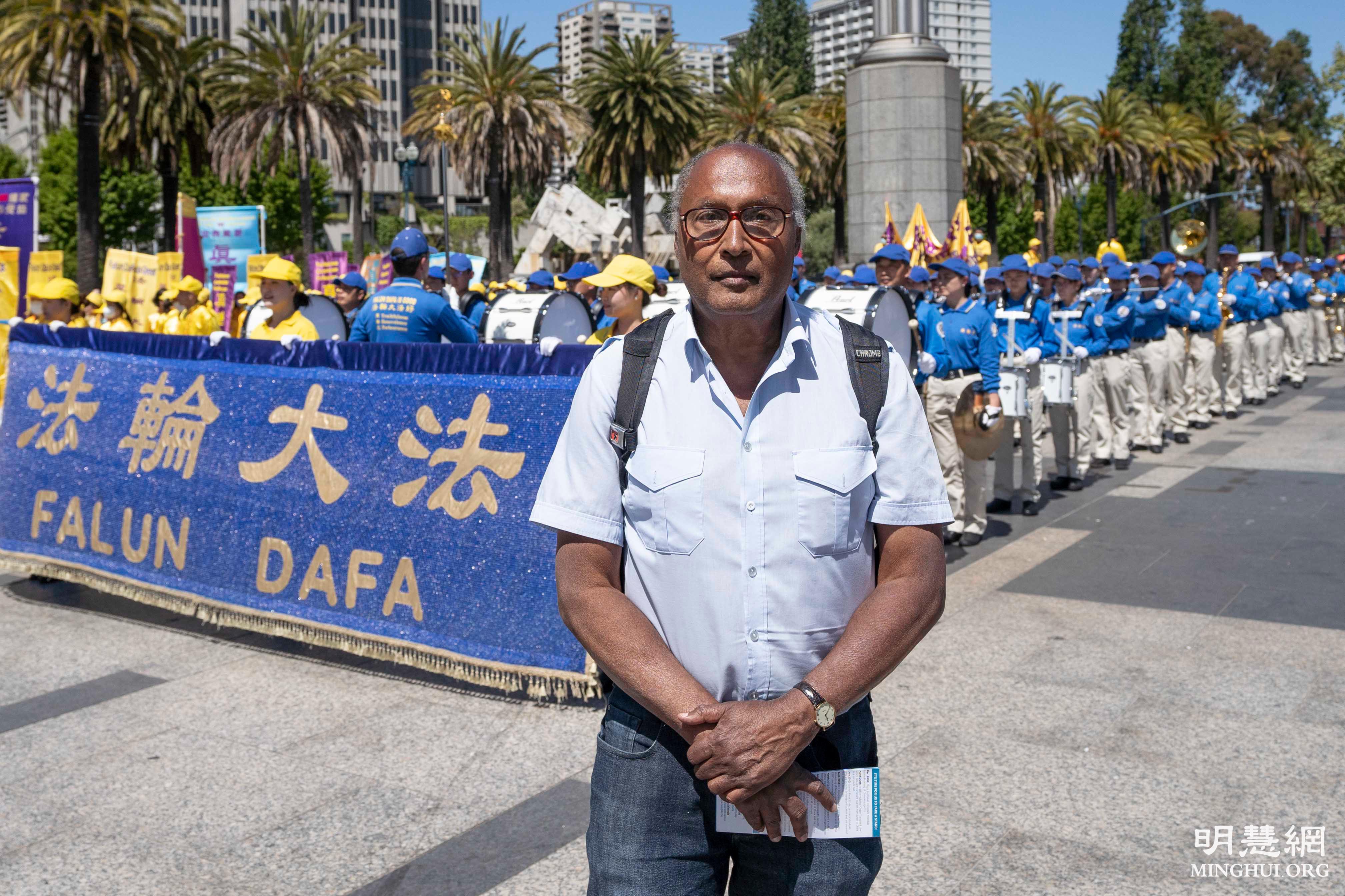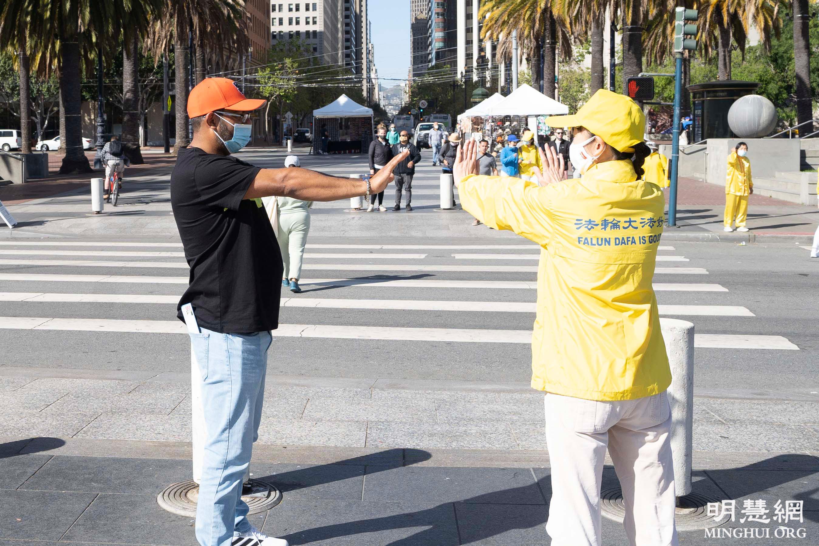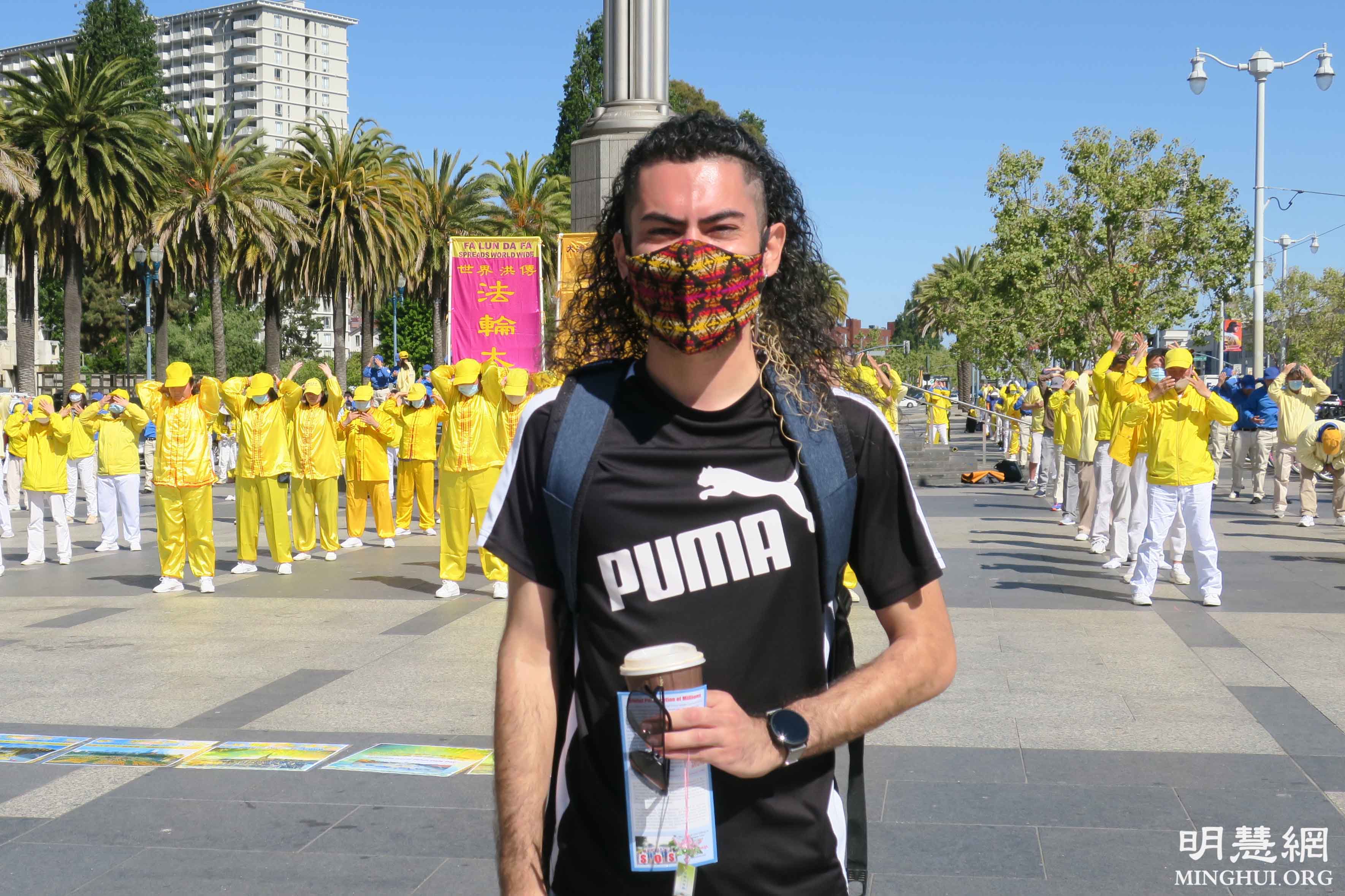 旧金山居民塞尔吉奥·马丁内斯(Sergio Martinez)是一名美发师,被法轮功学员祥和的炼功和音乐深深地吸引。他表示,“非常喜欢看法轮功学员在炼功,我在这个距离就能感受到一股很强的能量场。同时,今天旧金山天气非常好,看到他们的黄色衣服在阳光下是这么的光鲜亮丽,让人心情舒服。非常感谢你们在户外展示这么美好的功法,带给我们希望!”