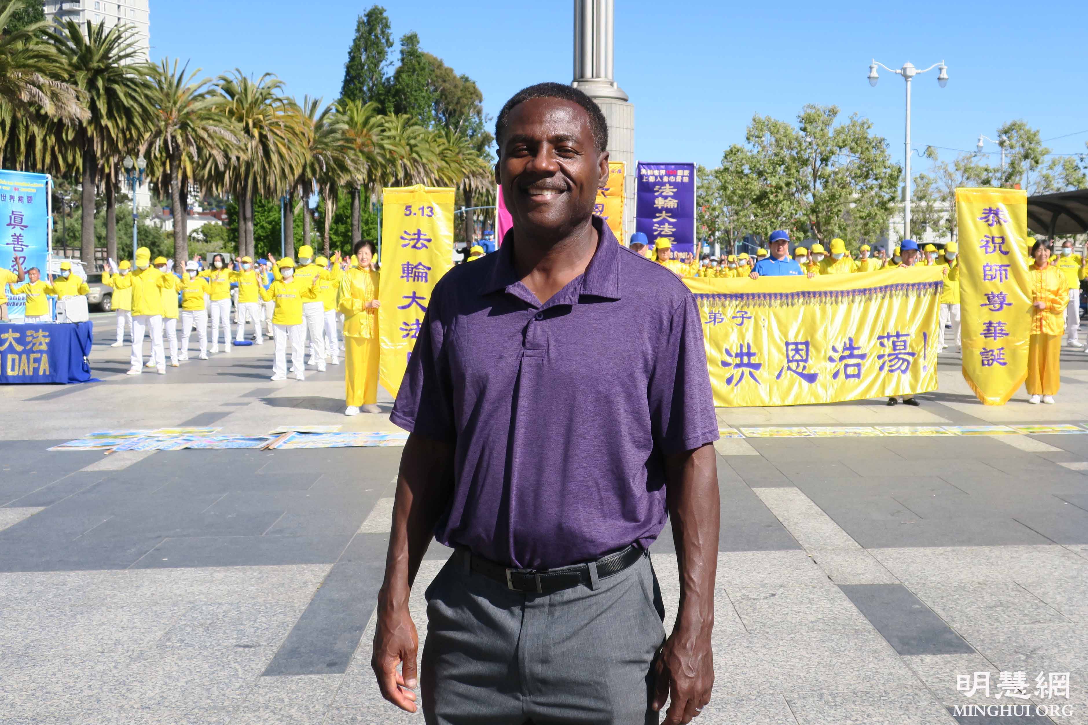 居住在东湾的达雷尔·亚当斯(Darrel Adams)先生,以前没有听说过法轮功,今天看到这么多法轮功学员聚集一起,庆祝法轮大法日,驻足观看久久不愿离开。他表示,“非常喜欢这个活动,他们看起来是如此善良和平,让我觉得自己已经融入其中,心情非常的愉快,这也让我想进一步的了解什么是大法。”