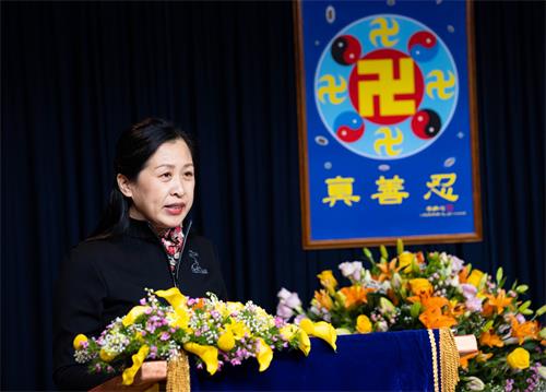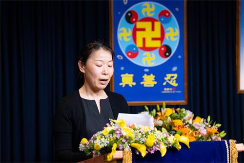 在法会上,吴女士分享了自己如何克服困难,在纽约中领馆前打横幅讲真相的过程与体验。