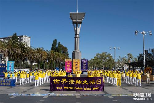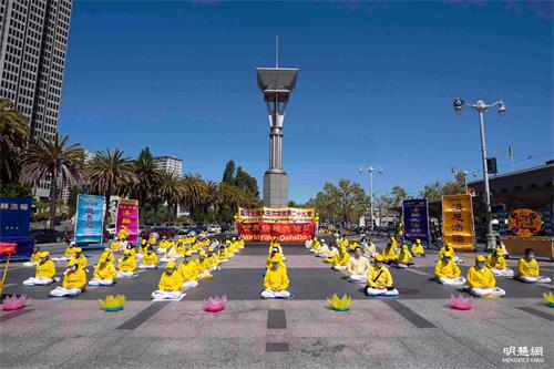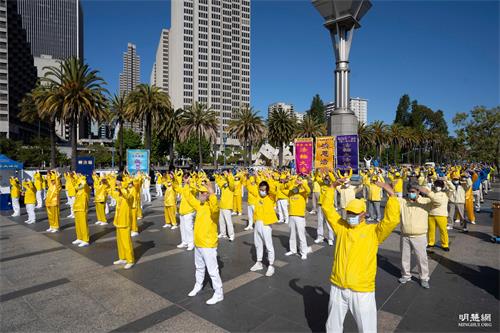 星期六,阳光明媚,法轮功学员首先在旧金山渡轮大厦(Ferry Building)集体炼功,展示祥和优美的功法,庆祝法轮大法日。许多游客被祥和的场面吸引,随着法轮功学员的炼功姿势在比划着学。现场还有民众主动要求学炼法轮功。