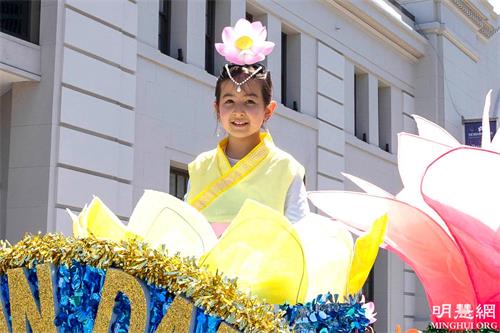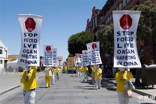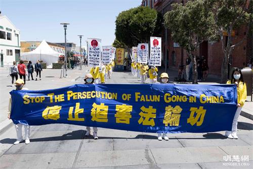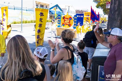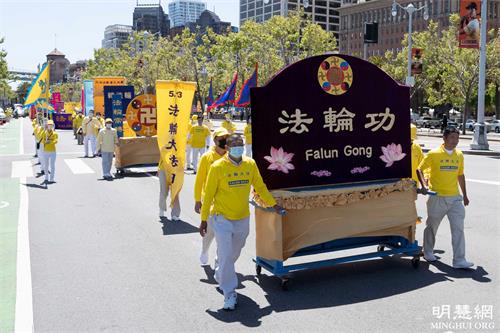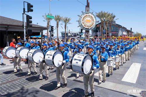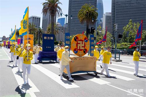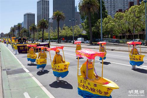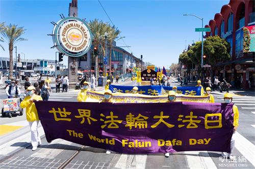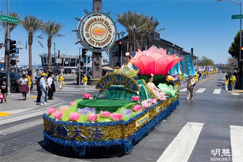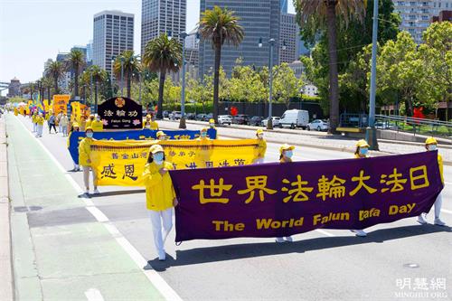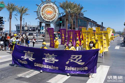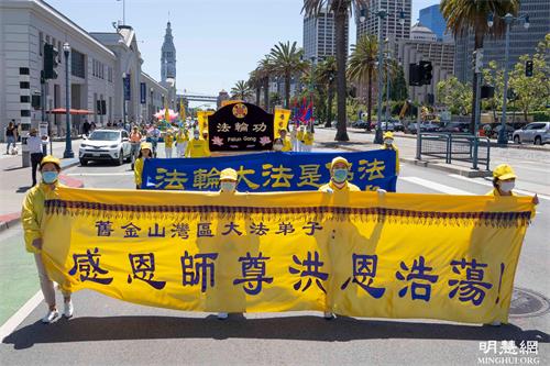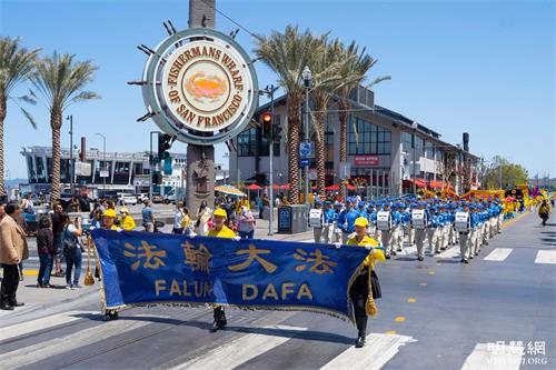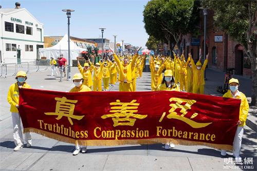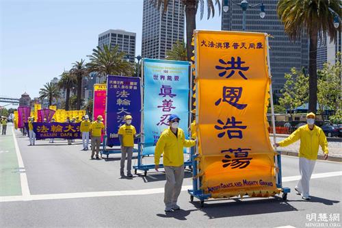 中午十二点,庆祝游行开始。法轮功学员从渡轮大厦出发,沿着恩巴卡德罗街(Embarcadero Street),经过渔人码头,抵达海上花园。一路上,法轮功学员为民众送去福音,期盼世人牢记“法轮大法好,真、善、忍好”,拒绝中共,远离瘟疫,获得平安。