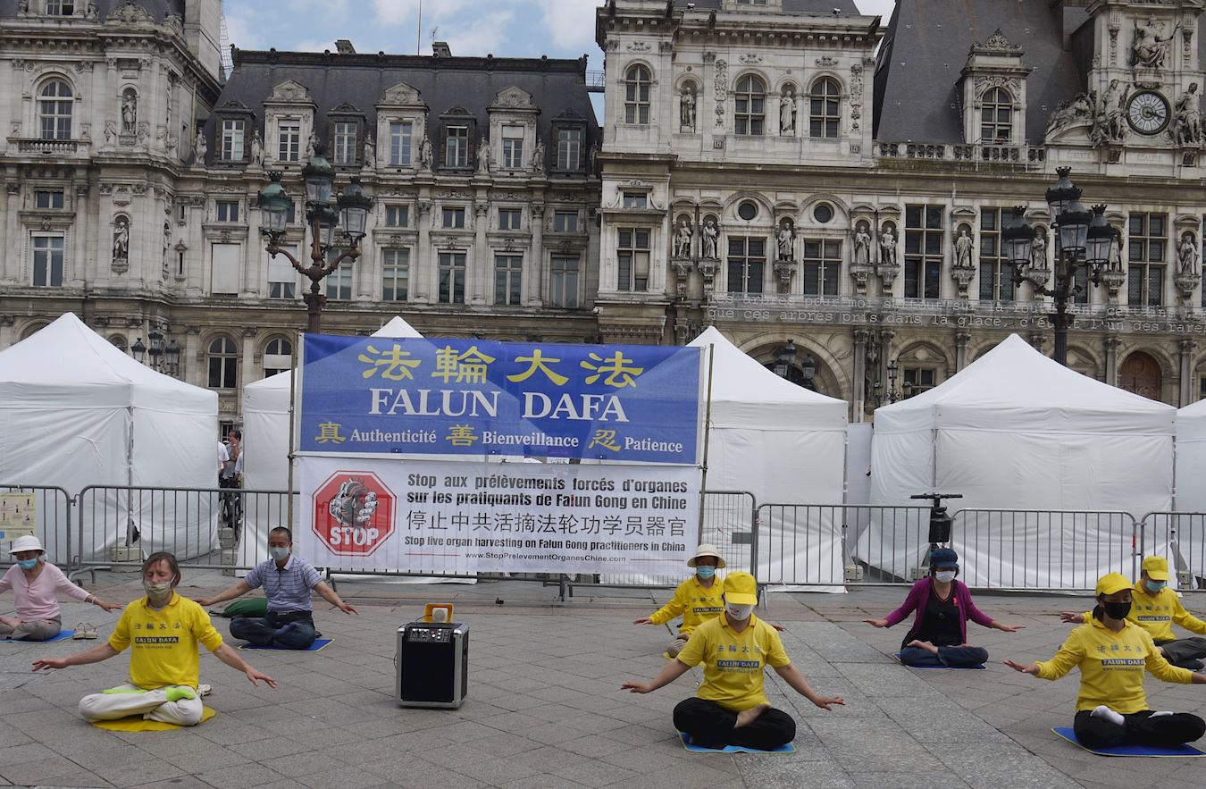 图1:法轮功学员在巴黎市政厅广场炼功打坐