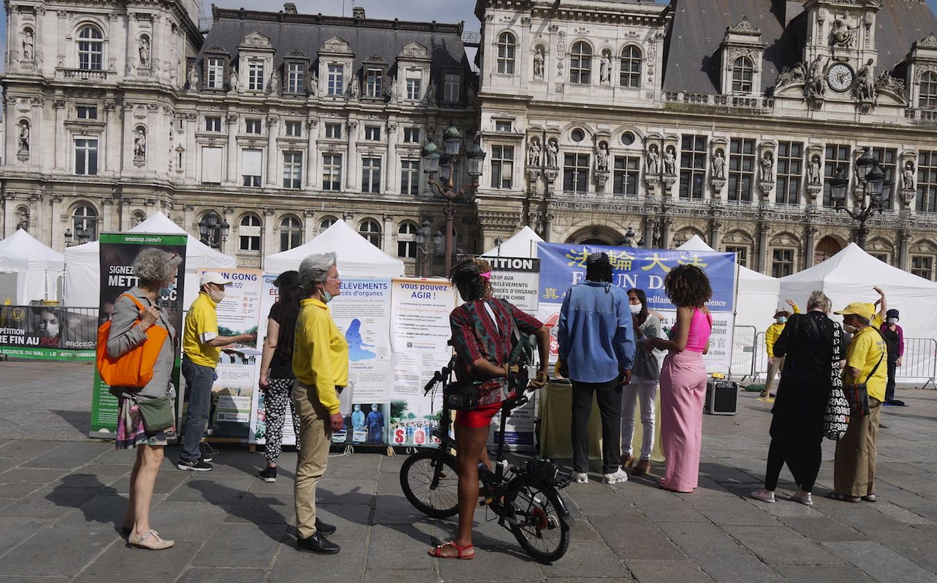 【明慧网二零二一年六月十六日】(明慧记者周文英巴黎报道)巴黎市政厅广场位于巴黎市中心的第四区,二零二一年六月十二日星期六下午,法轮功学员汇集在巴黎市政厅广场进行了炼功、讲真相和征集反迫害的签名活动。
