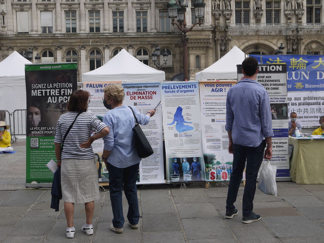 这一天天气晴朗,阳光灿烂。法国也进入逐渐解封的第三阶段,巴黎地铁,商店、餐饮业正常运营,露天咖啡厅、电影院都已开放。人们在市政厅广场周边的枕木上一边休息,一边观看法轮功学员的炼功打坐,伴随着炼功音乐学员们讲解着法轮功五套功法,有的学员讲述着法轮功学员因坚持信仰真、善、忍而在中国遭受的迫害。听闻真相的人们纷纷在征签表上签字,反对中共迫害法轮功,谴责中共践踏人权。
