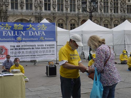 这一天天气晴朗,阳光灿烂。法国也进入逐渐解封的第三阶段,巴黎地铁,商店、餐饮业正常运营,露天咖啡厅、电影院都已开放。人们在市政厅广场周边的枕木上一边休息,一边观看法轮功学员的炼功打坐,伴随着炼功音乐学员们讲解着法轮功五套功法,有的学员讲述着法轮功学员因坚持信仰真、善、忍而在中国遭受的迫害。听闻真相的人们纷纷在征签表上签字,反对中共迫害法轮功,谴责中共践踏人权。