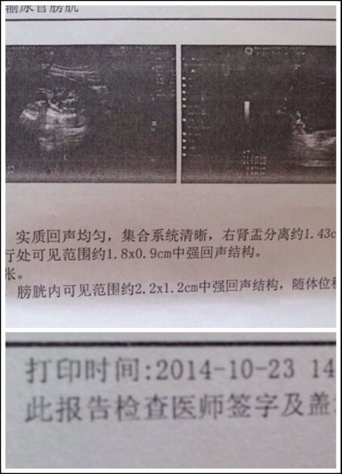 医生怀疑是阑尾炎。这是一家专科妇产医院,所以家人送我去另一家综合医院,挂了外科,看看是不是阑尾炎。检查结果出来后,医生说不是阑尾炎。没办法,只好又挂妇产科,并住院继续检查,最后诊断为肾结石,详情见B超图(下图一)。