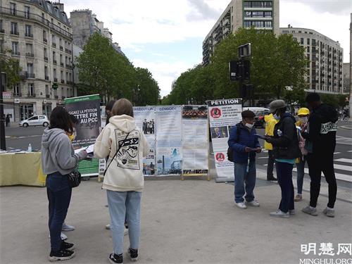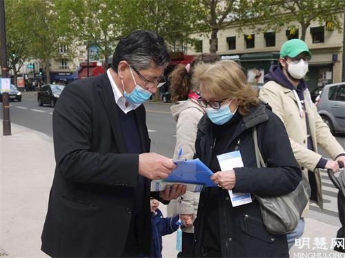 春夏之际,法国已进入逐步解封的第二阶段,街上来往行人很多。人们一走一过之间,在征签表上郑重地签字,表达他们对法轮功反迫害的支持,以及对中共的迫害法轮功的谴责。