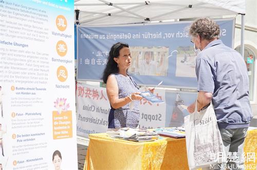 这一天阳光明媚,法轮功学员的真相展点设立在英戈尔施塔特市中心步行区的特蕾莎大街,这里商店、餐馆、咖啡店密集,经过真相展点的行人络绎不绝。很多人驻足,与法轮功学员交谈,了解真相。