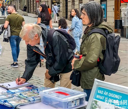 这个周末时值仲夏节、是瑞典的法定假日,法轮功学员的活动场地前来来往往的行人络绎不绝。当人们得知以修炼真、善、忍为原则的法轮功学员在中国被中共残酷的迫害已经二十二年了,都觉得不可思议。了解了真相的人们径直走到签字簿前签名,希望能帮助早日结束迫害、解体中共。