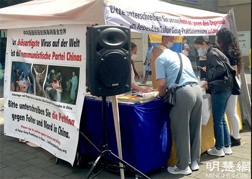 【明慧网二零二一年六月二十九日】二零二一年六月二十六日,德国中部部份莱茵-内卡地区法轮功学员们,在曼海姆(Mannheim)举办信息日活动,向民众讲述法轮功修炼者为坚持自己的信仰,在中共极权统治下遭受各种迫害,甚至被活摘器官。并以征集签名的形式反迫害,向当地市民介绍法轮大法。