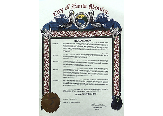 继库卡蒙加牧场市将五月十三日为该市的“世界法轮大法日”后,著名的旅游胜地圣塔莫妮卡市也将该日定为“世界法轮大法日”。