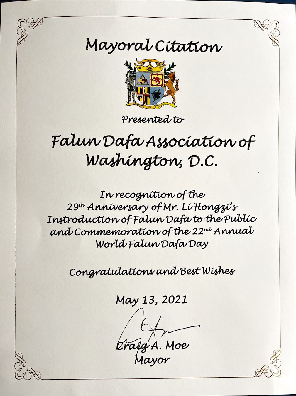 向华盛顿特区法轮大法学会颁发市长褒奖令