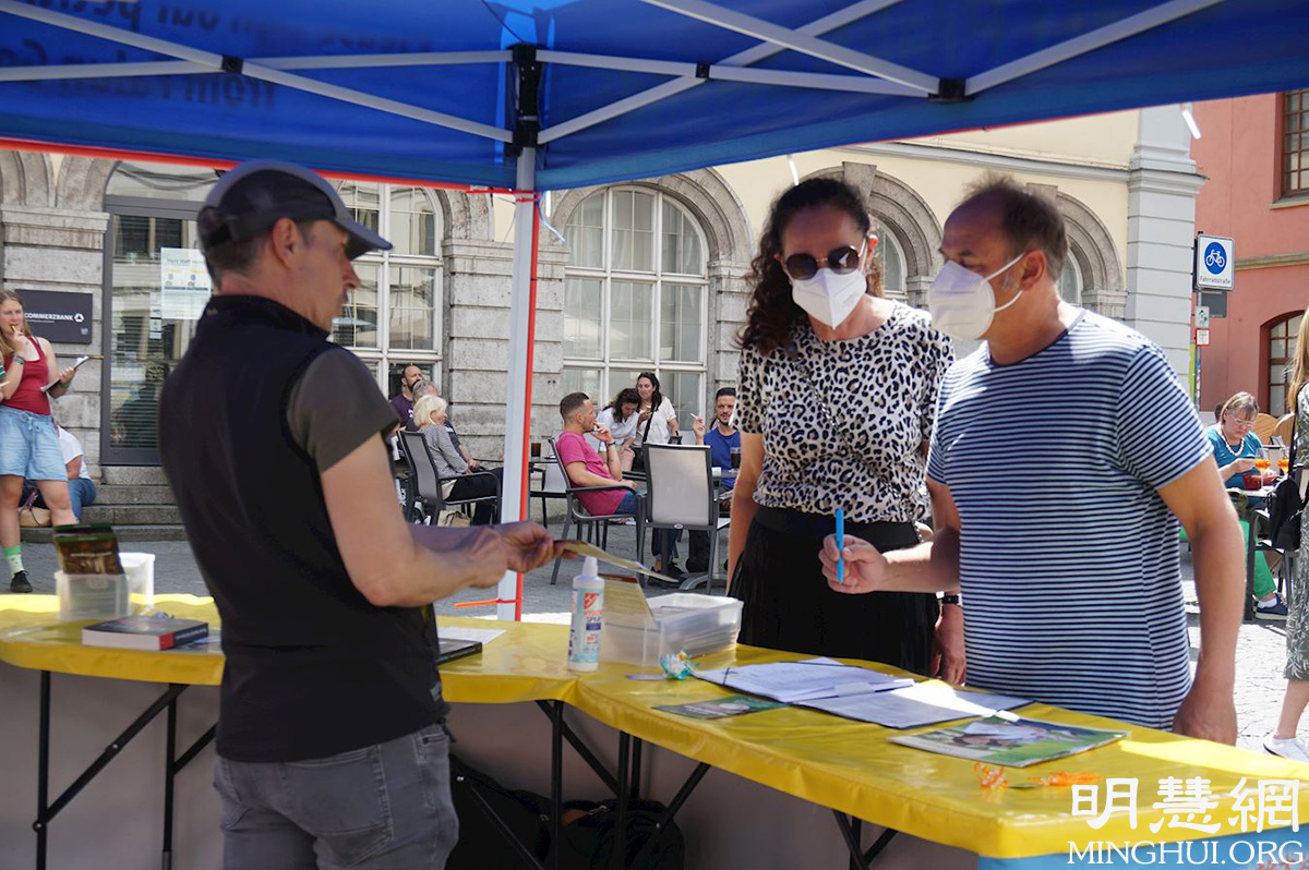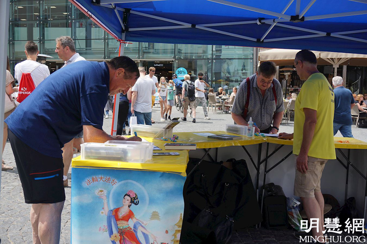 一位骑自行车路过的德国中年人,在看到横幅内容后停下来,直接来到展点,在两个征签表上都签了名。他说,“我关注中国发生的事情大约有二十年了,我知道法轮功被迫害,我知道中共镇压学生民主运动,它在西藏、新疆、香港到处犯下的罪恶。所以,我从来不买中国产品,不管它多便宜,因为我不想支持这个独裁政府。可惜的是,很多西方政治家、西方企业包括德国企业在内,为了利益对中共卑躬屈膝,养大了这头狼。是世界该警醒的时候了!”