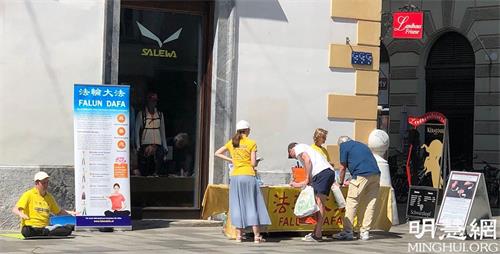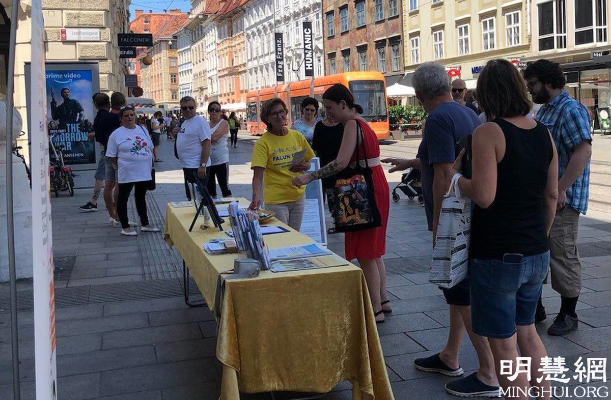 【明慧网二零二一年七月十三日】二零二一年七月十日,法轮功学员在奥地利施蒂利亚州州府格拉茨的州政府前的绅士街上,举办反迫害二十二年的讲真相活动。