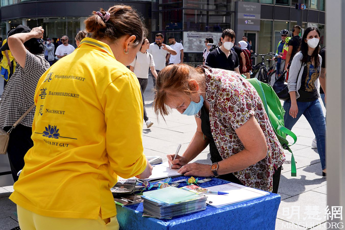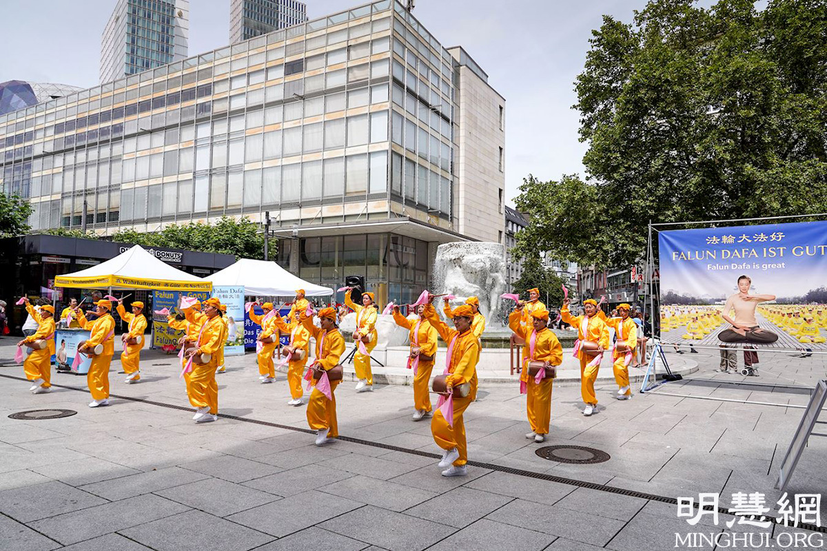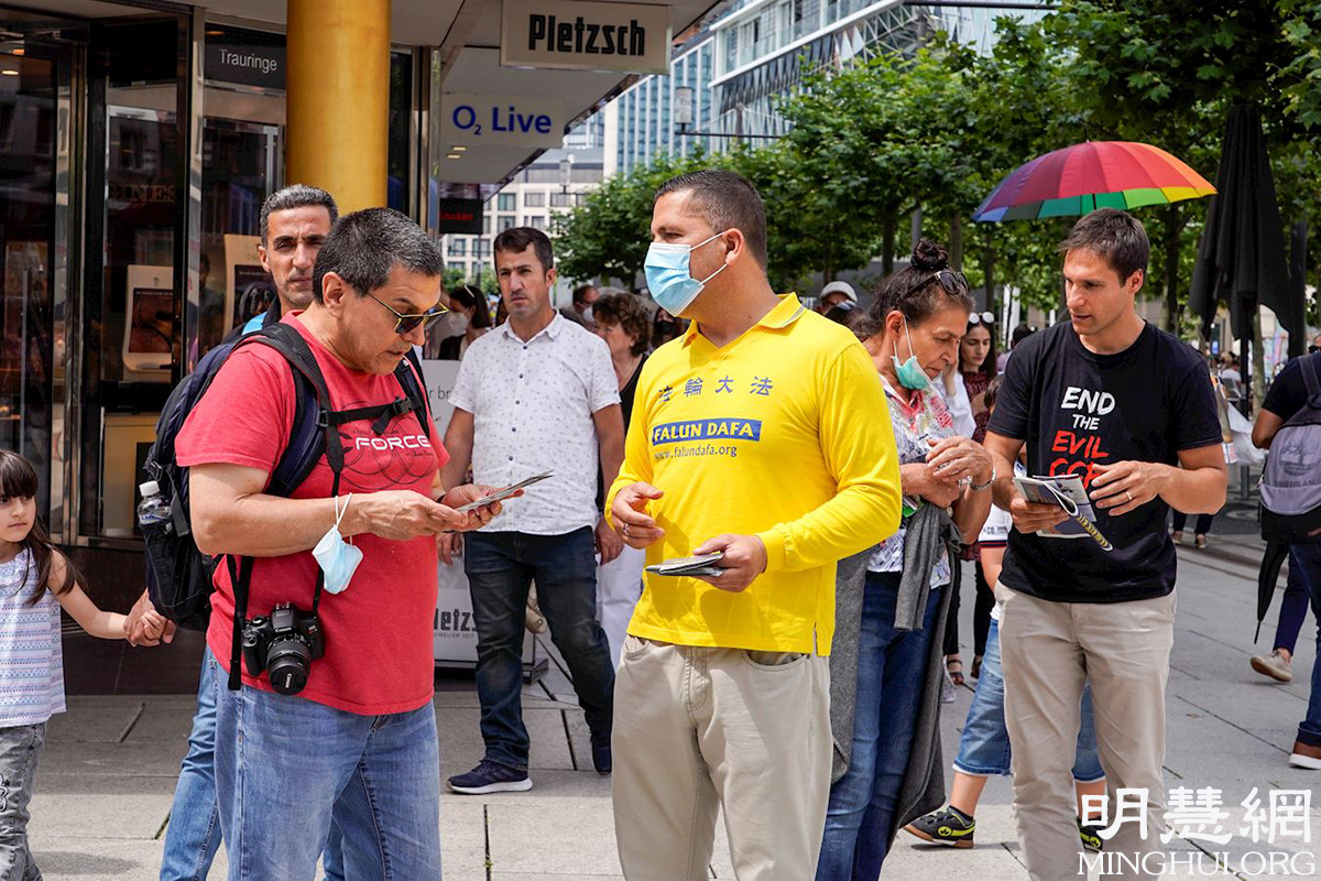 【明慧网二零二一年七月十三日】二零二一年七月十日,法轮功学员反迫害二十二年之际,德国部份法轮功学员在法兰克福举行了活动。腰鼓队的表演、功法的展示以及法轮功真相的传播吸引了许多民众观看、谘询,签名支持。自去年疫情爆发以来,德国政府制定了一系列的严禁措施,今年六月份,解除了一些规定,包括宵禁后,法兰克福著名的菜尔商业大道的商店重新恢复营业,大街上又如前热闹非凡。
