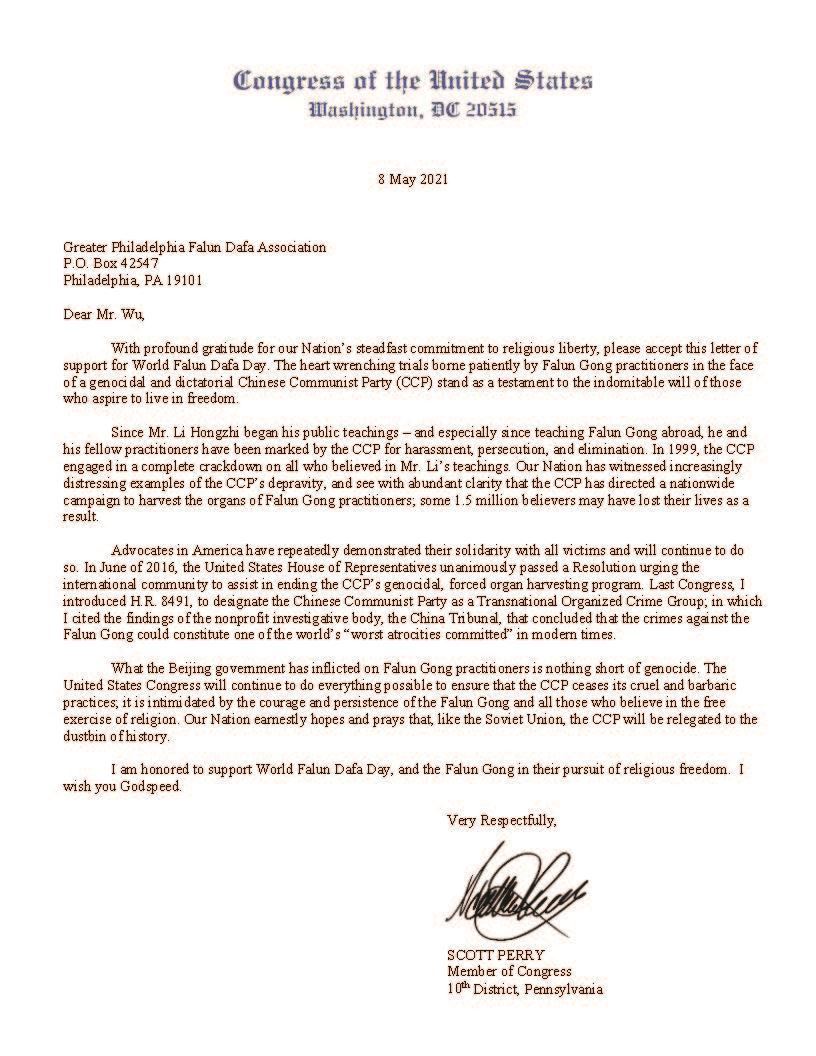 宾州国会议员佩里(Scott Perry)和道尔(Mike Doyle)先后给大费城地区法轮大法学会发出贺信,同时也谴责中共持续迫害法轮功的罪行,并表示要致力于帮助终止中共迫害法轮功的罪行。佩里众议员(Scott Perry)在褒奖信中谴责中共持续迫害法轮功群体的罪行,并表达对这一和平追求信仰自由群体的敬佩和支持:“面对群体灭绝和独裁的中国共产党(CCP),法轮功修炼者在惨烈的迫害中坚韧地挺立,证明着那些渴望生活在自由中的人们的不屈不挠的意志。”