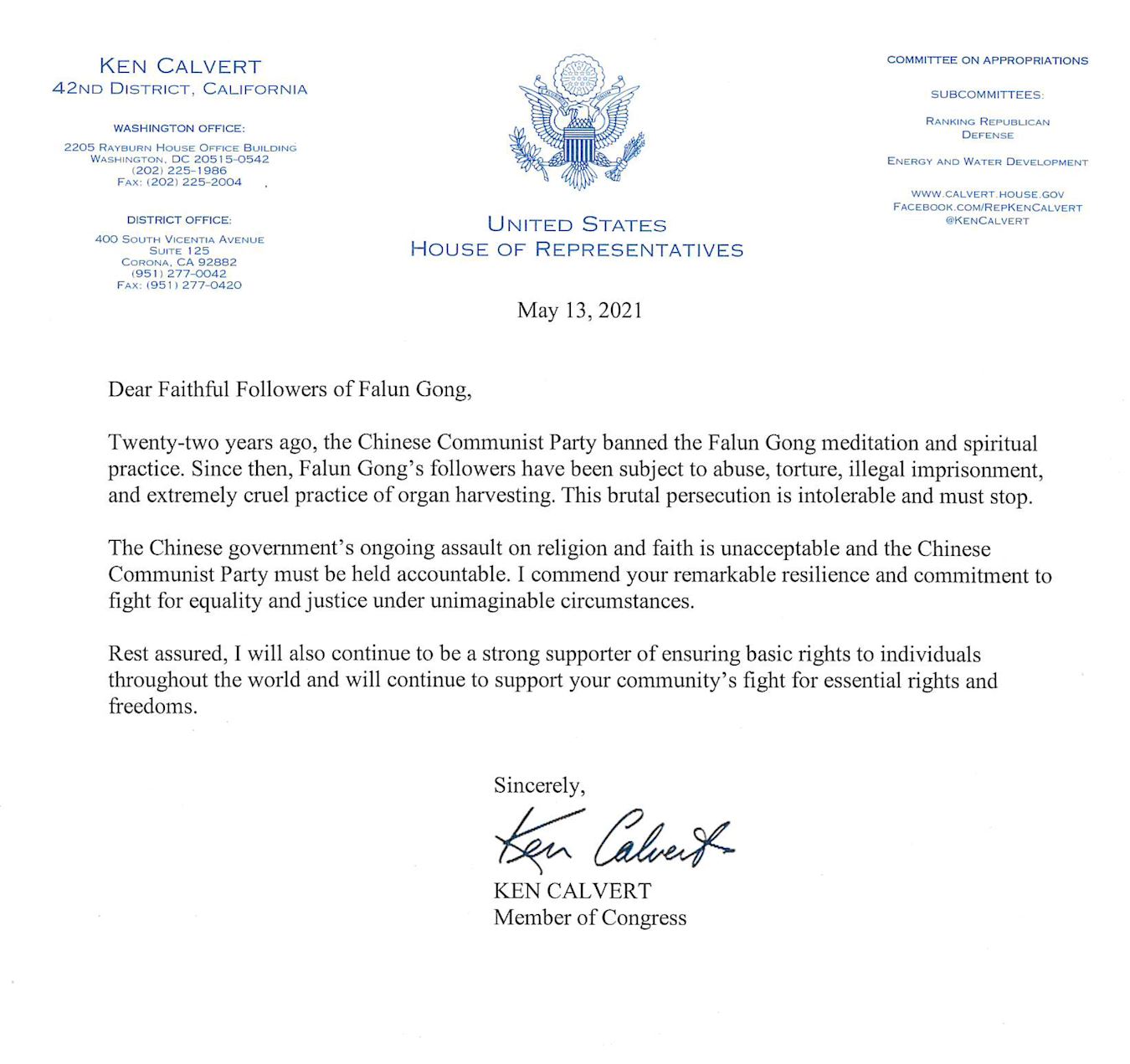 二零二一年五月,加州第四十二区国会议员肯·卡瓦特(Ken Calvert)在贺信中赞扬法轮功学员在不可想象的艰难环境中,仍坚韧不屈争取平等与公正的非凡精神。他说,“法轮功学员遭到中共的虐待、酷刑、非法监禁、被残忍地活摘器官,这种残酷的迫害是不能被容忍的,必须立刻停止。”“中共政府对信仰的持续侵害是不能被接受的。中共必须被追责。请相信,我将继续支持你们争取基本人权自由的抗争。”