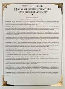 决议案中说:由伊利诺伊州众议院第102届议会决议,在中共发起旨在消灭法轮功的全国性的严重迫害的22周年之际,我们强烈谴责对法轮功的迫害。我们鼓励美国医学界帮助提高人们对在中国进行的不道德器官移植的认识;我们谴责中共在中国进行的国家支持的活摘器官的行径。