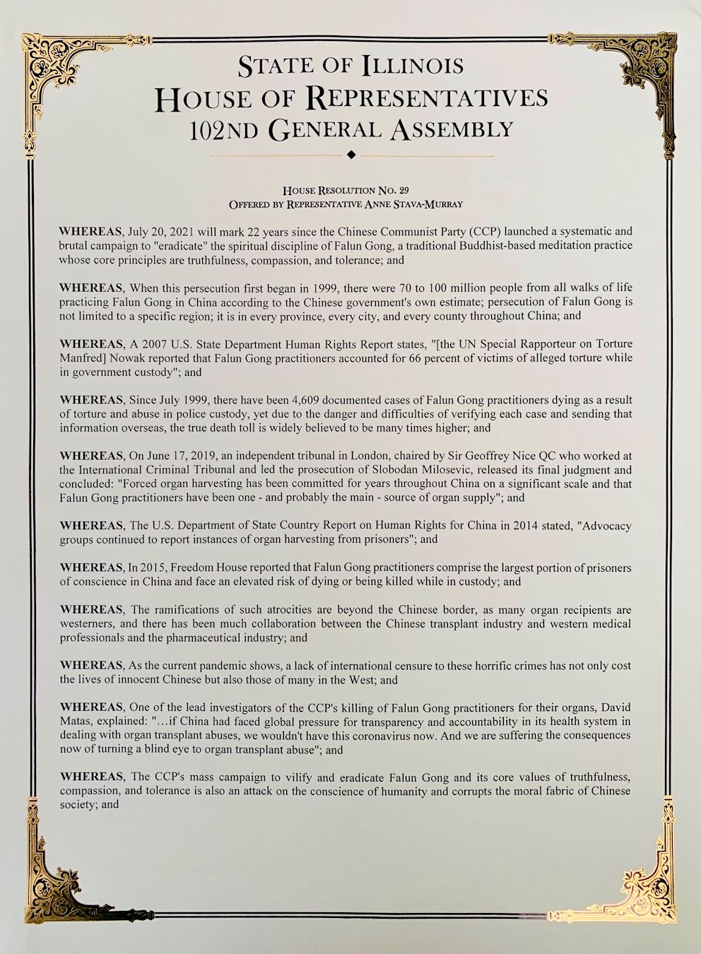 二零二一年四月,美国伊利诺伊州众议院通过了《HR0029号议案》,“强烈谴责中共对法轮功的迫害”,“谴责中共在中国进行的国家支持的活摘器官的行径。”本决议案由伊州众议员斯塔瓦-穆雷(Anne Stava-Murray)发起,在伊利诺伊州众议院第102届议会获得通过。