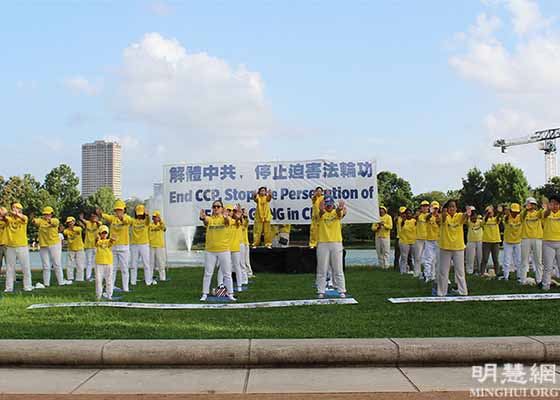 七月十日,休士顿法轮功学员举办反迫害系列活动:集体炼功与烛光夜悼,向市民展示法轮功学员炼功的美好,揭露中共的邪恶。