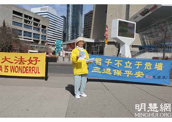 竖立在加拿大多伦多市中心的国家电视塔是加拿大国家十大景观之一。今年86岁法轮功学员黄韵琴,二十多年一直坚持在这里讲法轮功真相。