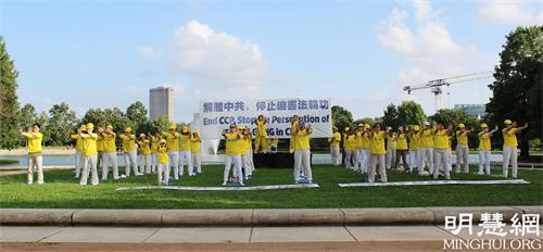 ![]() 图1 - 2:休士顿法轮功学员在荷门公园集体炼功 |