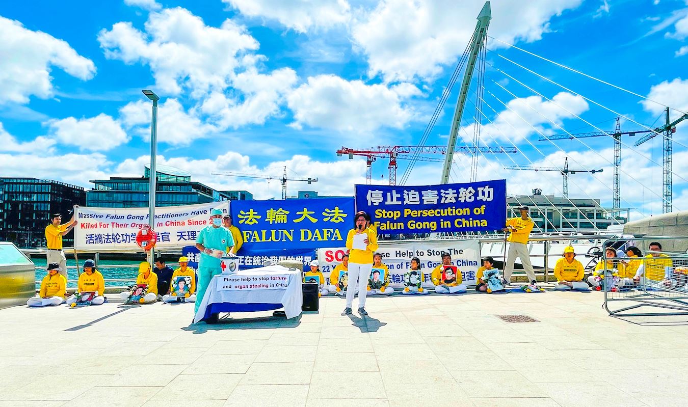 图1:二零二一年七月十四日,爱尔兰法轮功学员在都柏林国际会议中心外举行集会,揭露中共活摘器官罪行和对法轮功长达22年的迫害。