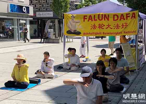 二零二一年七月十日,德国法轮功学员在南部格平根市小城举办信息日活动,吸引了许多路人驻足观看。